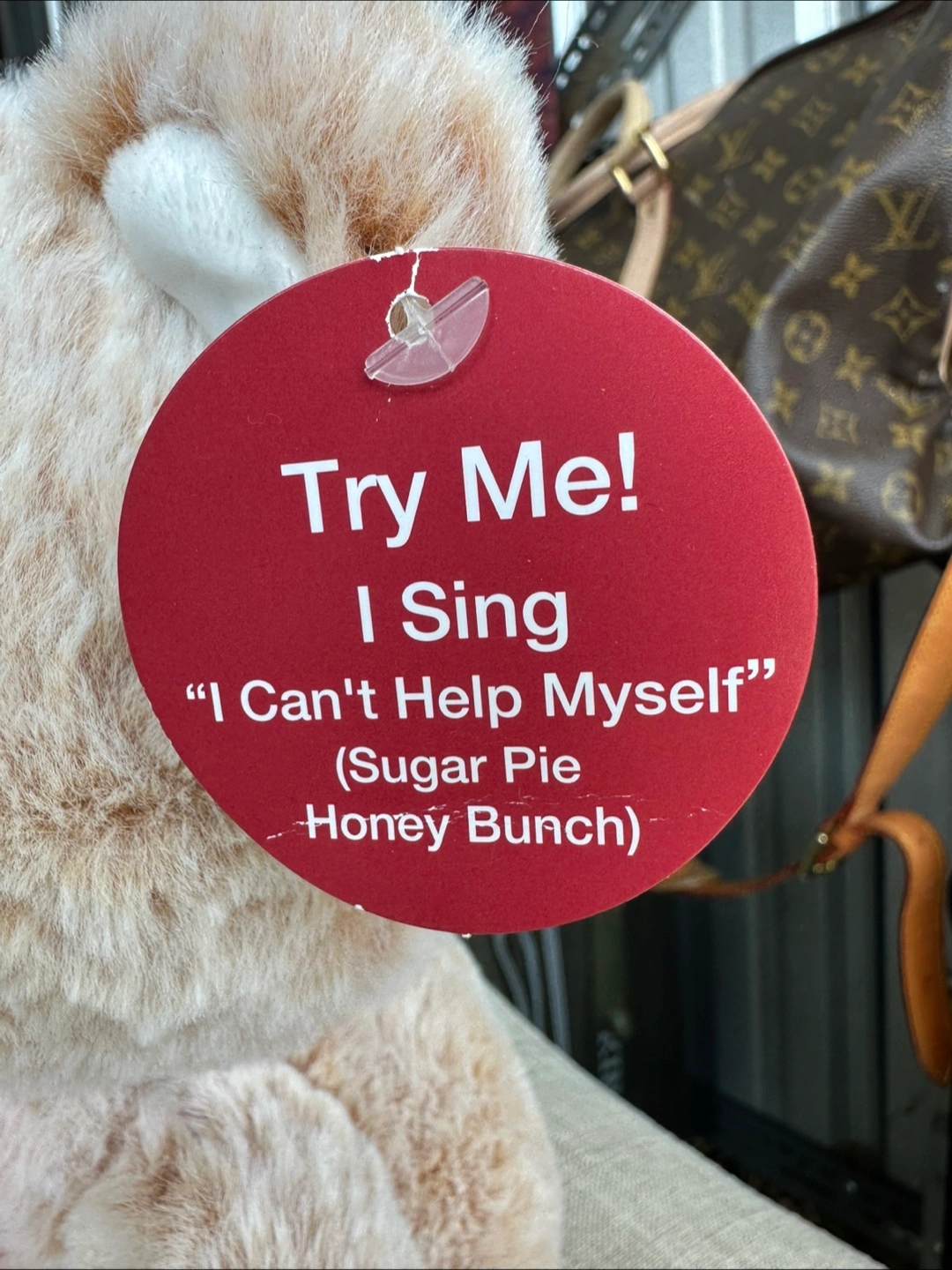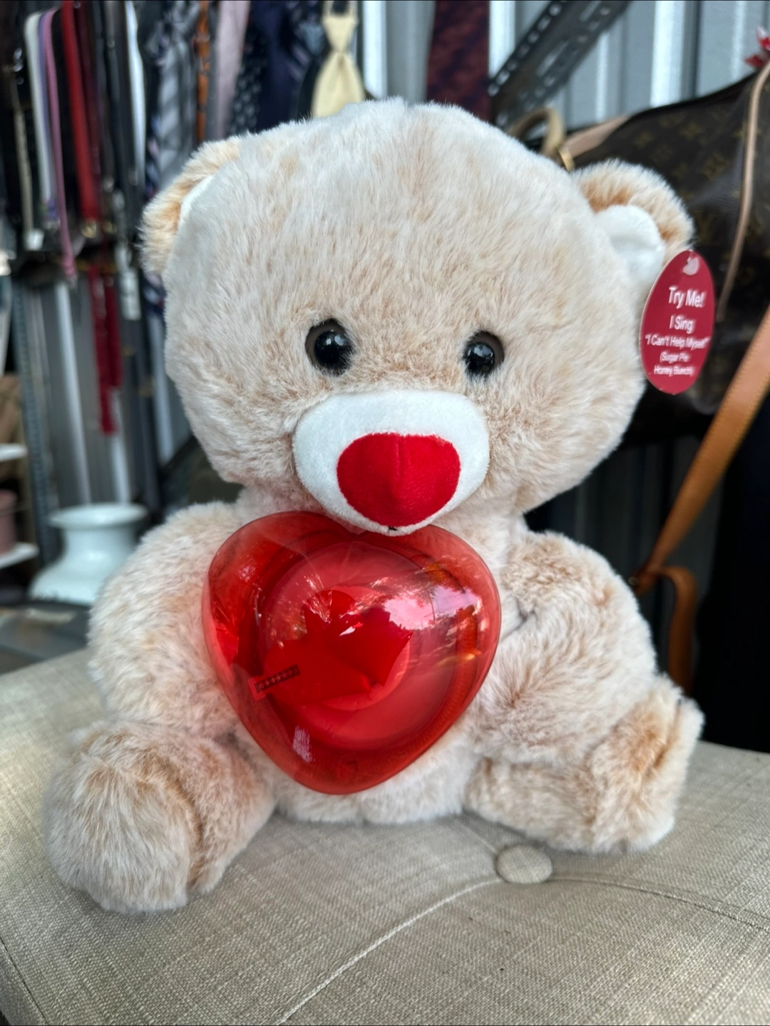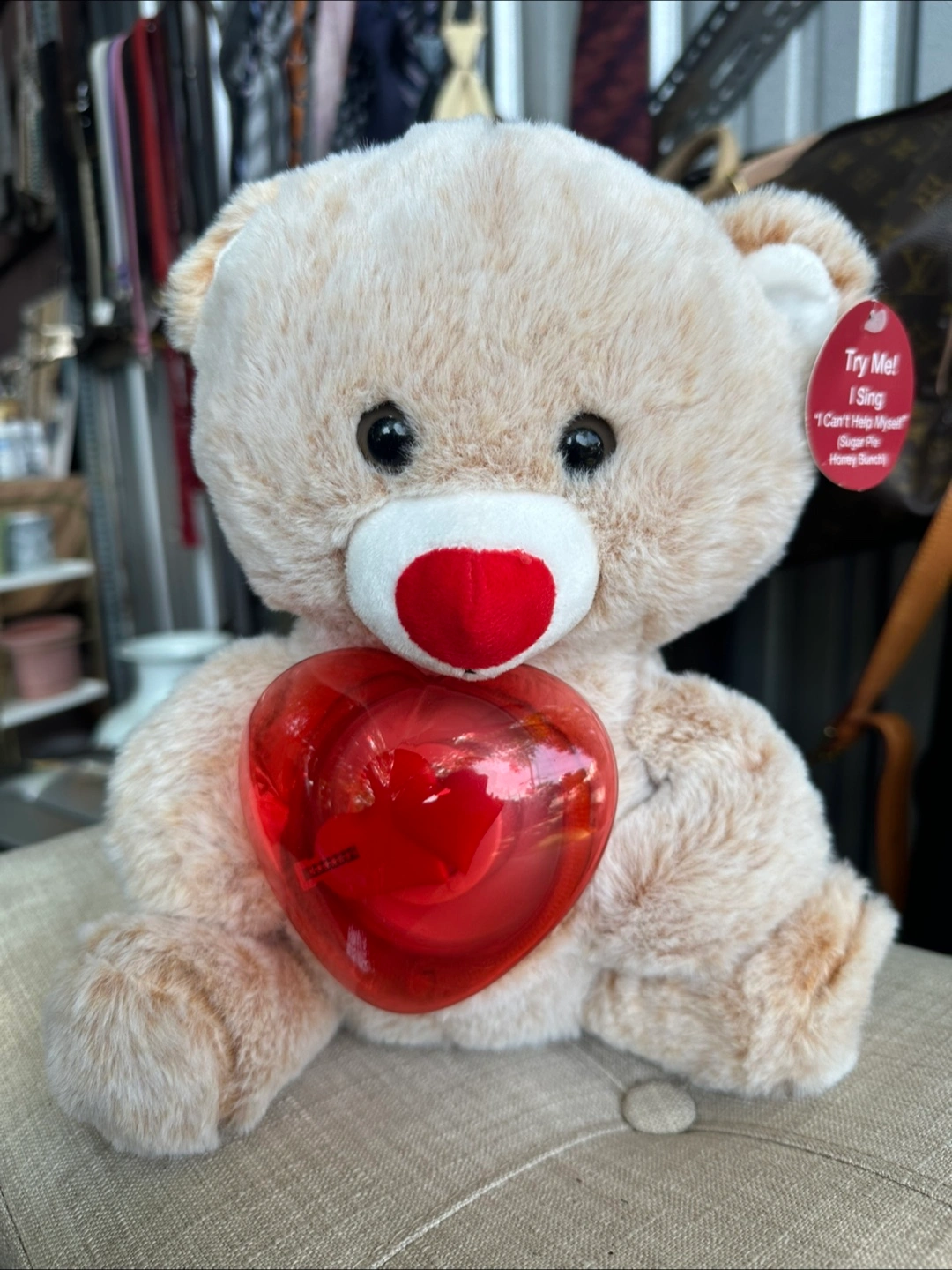 This adorable teddy bear is ready to sing its heart out! It holds a red heart and plays "I Can't Help Myself (Sugar Pie Honey Bunch)" when you press the button. It's in great condition and ready to bring joy to a new home