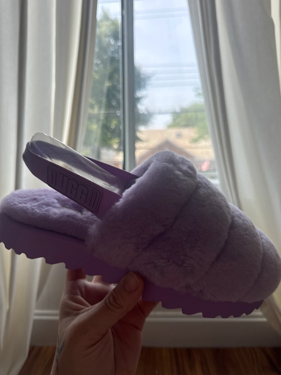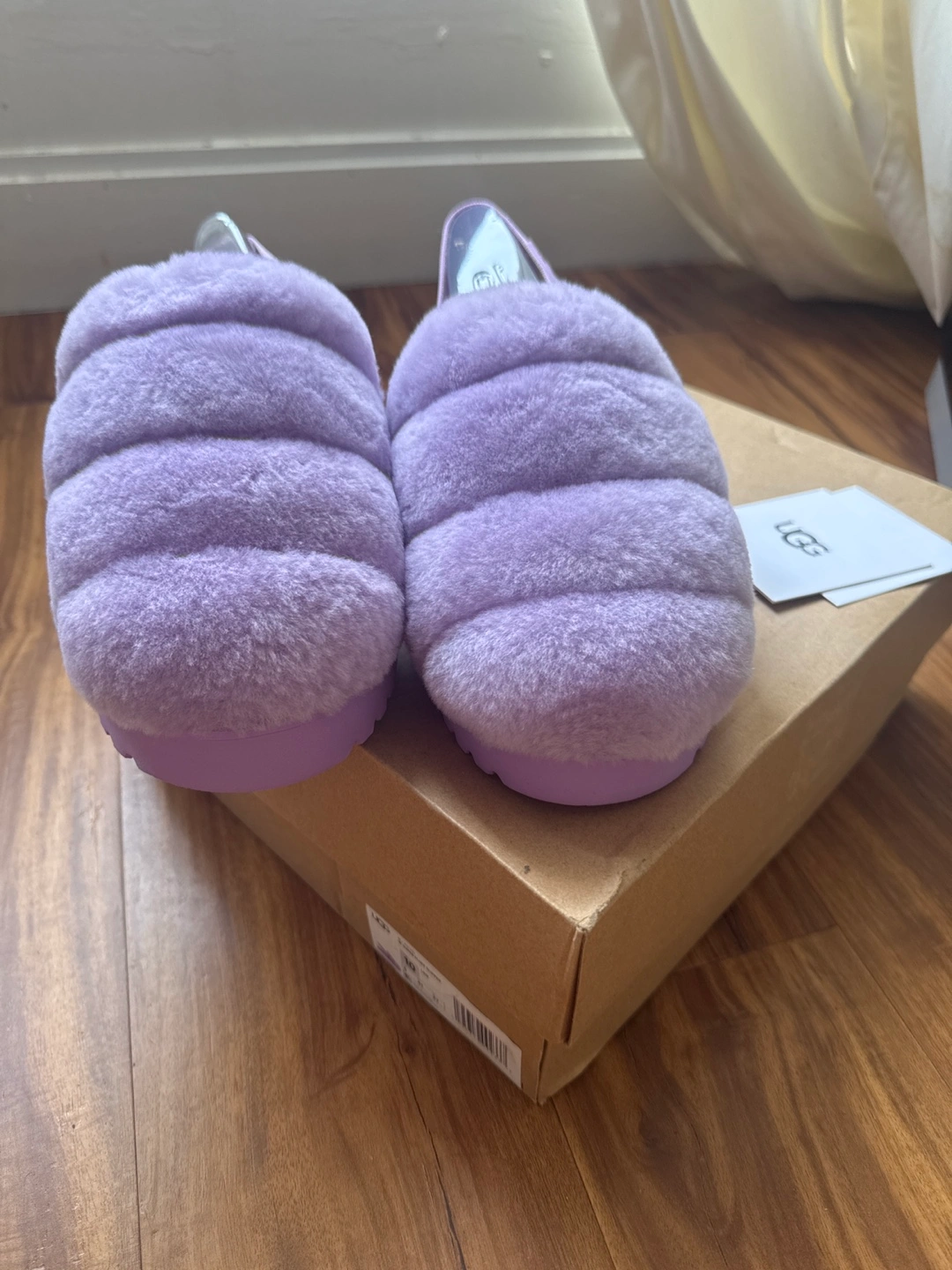 These UGG Fluff Yeah Slides are in a beautiful lavender color! They are super soft and comfy, perfect for lounging around the house or adding a fun pop of color to your outfit. The slides are in brand new and never been worn and come with the original box