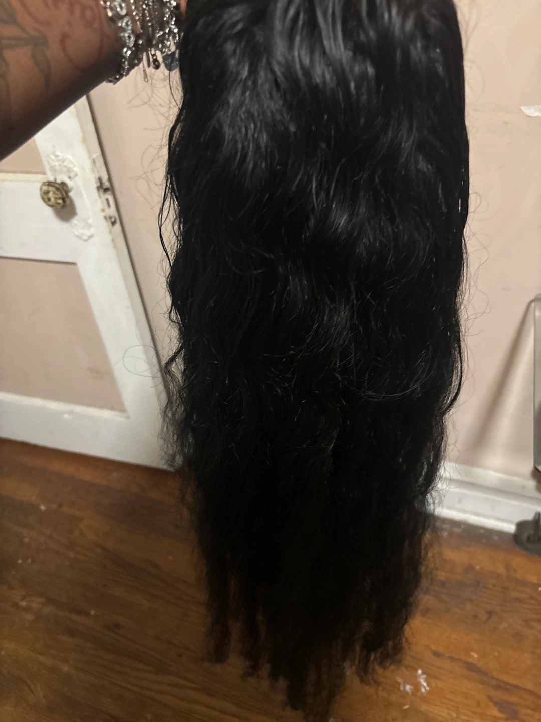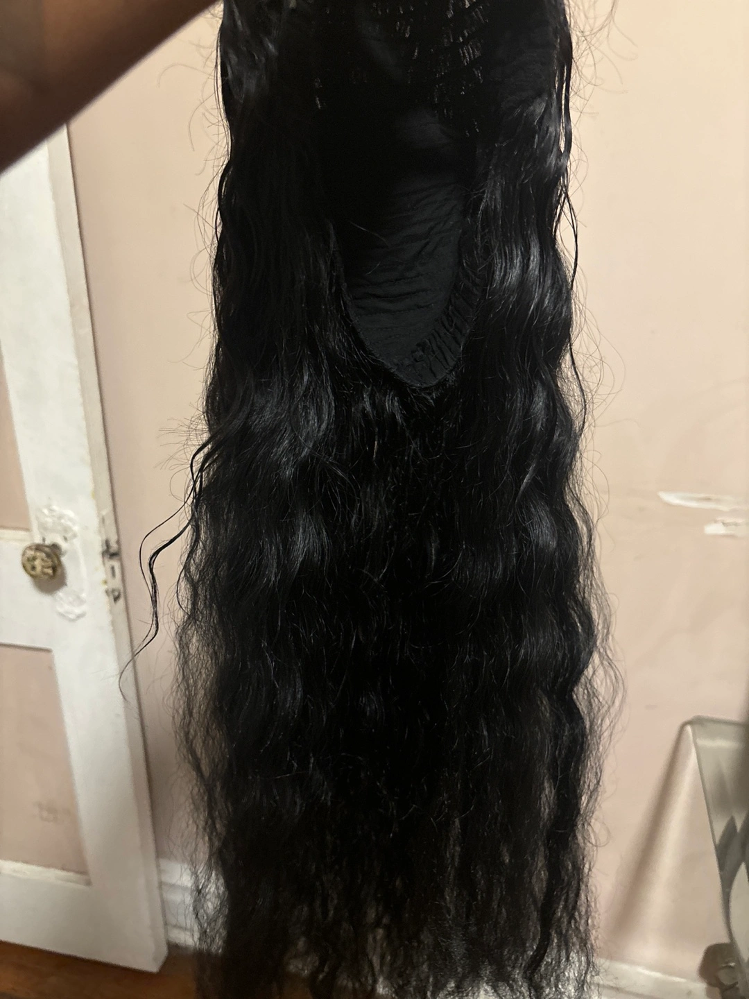 51Selling a black wavy wig. It appears to be in good condition and ready for a new home! The wig has a lace front. Human hair!