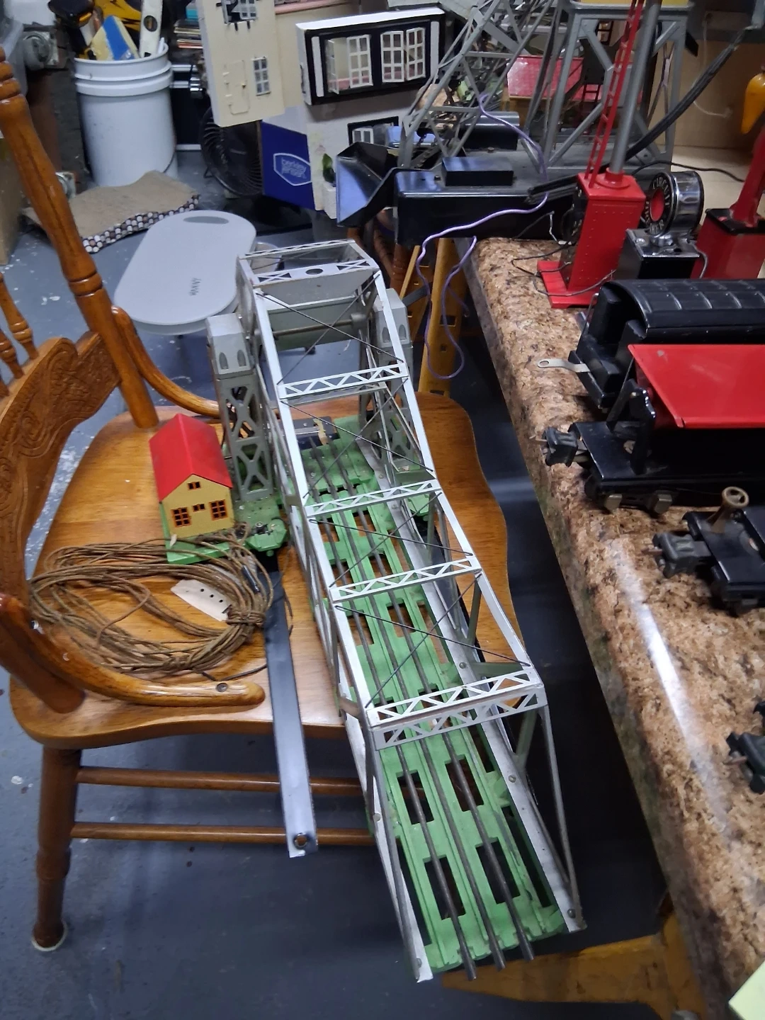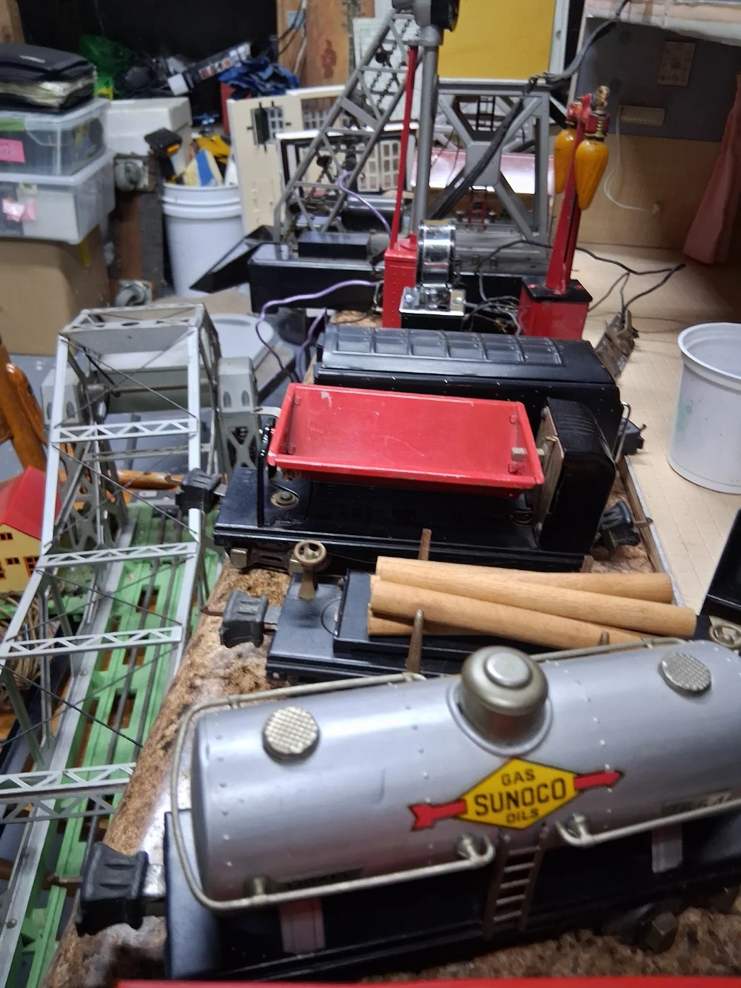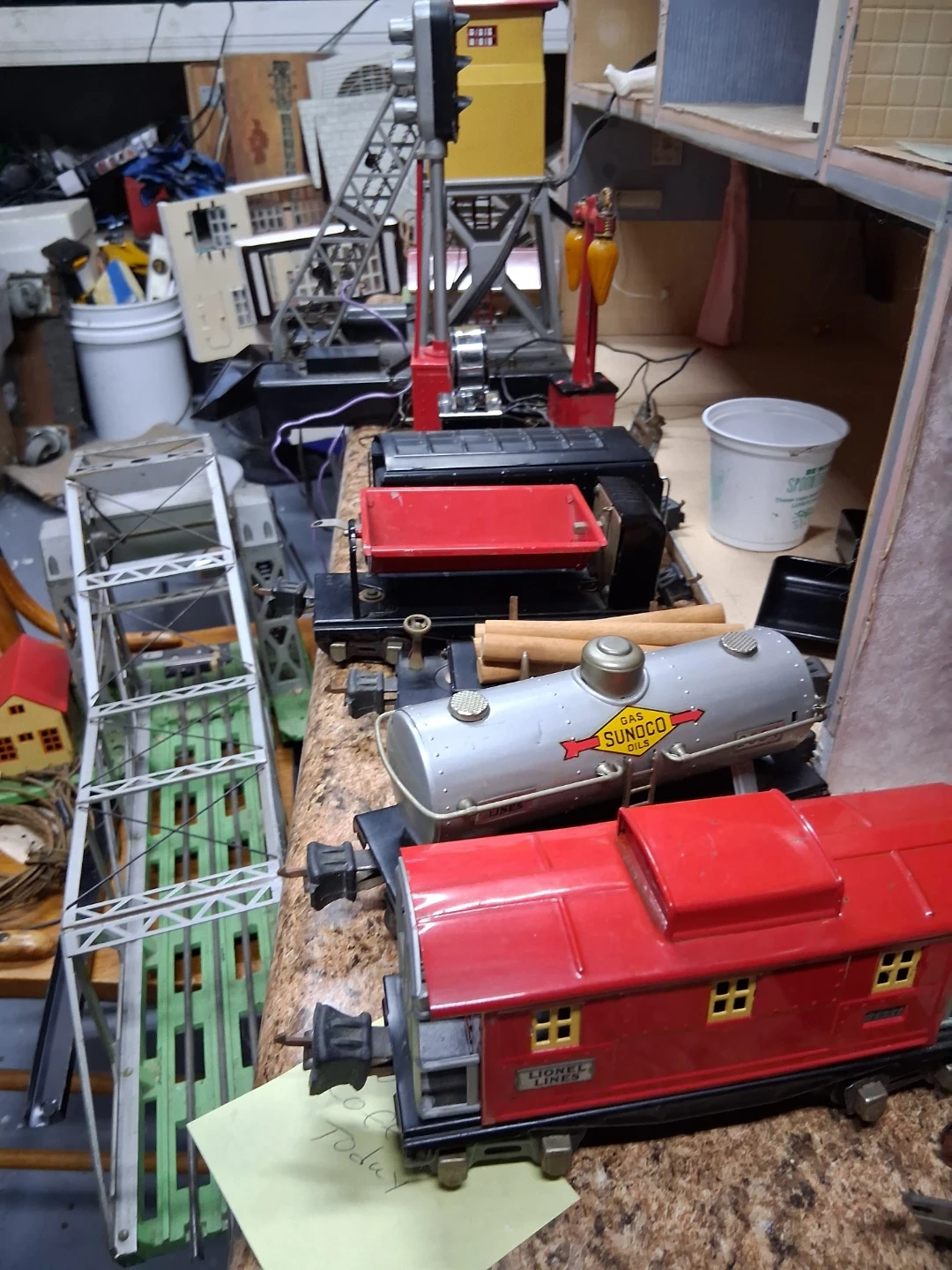 Lot of vintage Lionel O gauge model train accessories including buildings, track bridge, and signal lights. Also includes a whistle house Crane to lift and figures. Great for starting or expanding a model train layout!I Have a prewar 1939 collection of Lionel trains in great condition must see pics