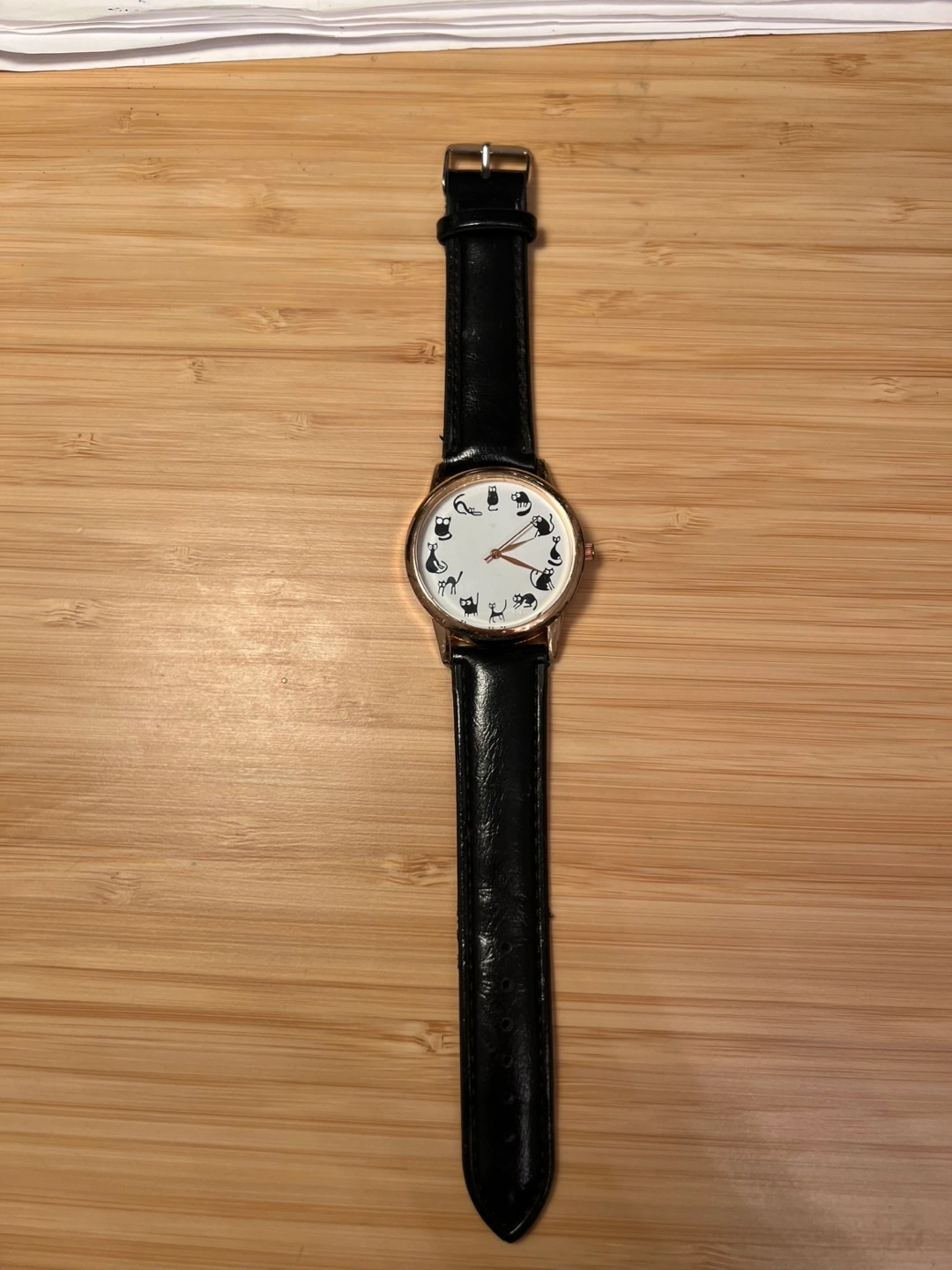 127Here's a cute watch with a black leather band and a fun cat design on the face! Brand new It just needs a battery Smoke free house