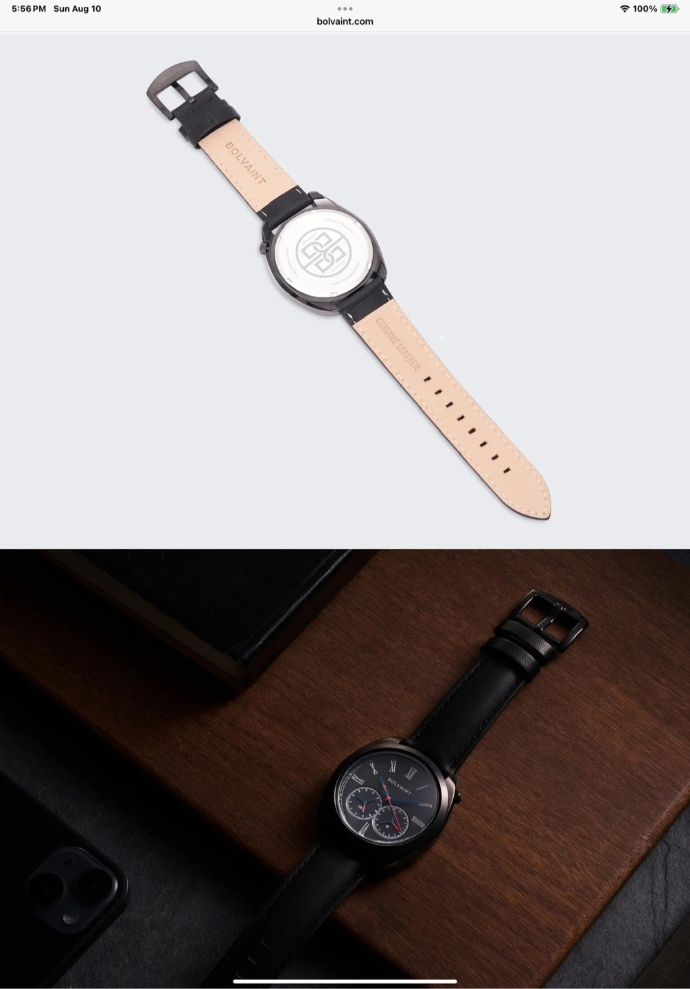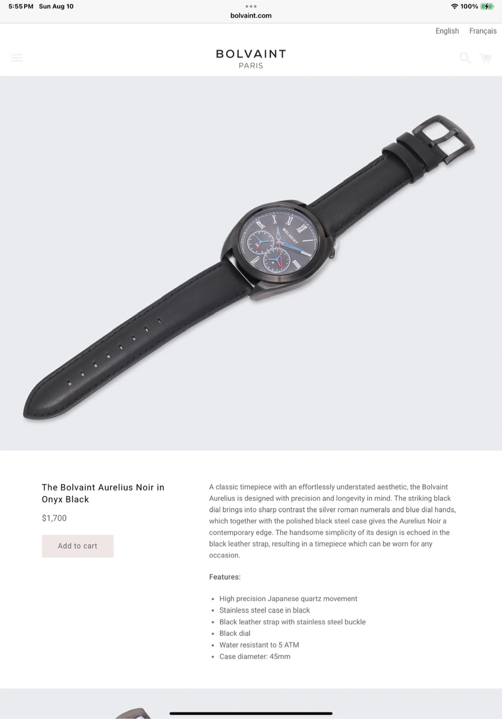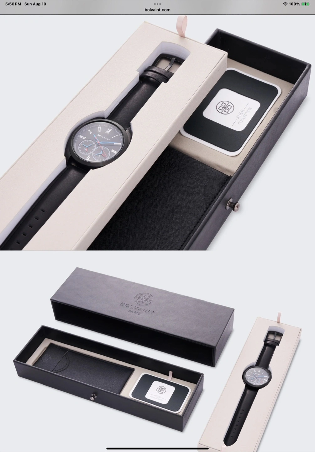 76Selling a Bolvaint Aurelius Noir watch in Onyx Black! This timepiece has a classic design with a modern edge. Key features include: - High precision Japanese quartz movement - Stainless steel case in black - Black leather strap with stainless steel buckle - Black dial - Water resistant to 5 ATM - Case diameter: 45mm It comes with the original box