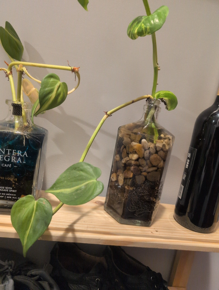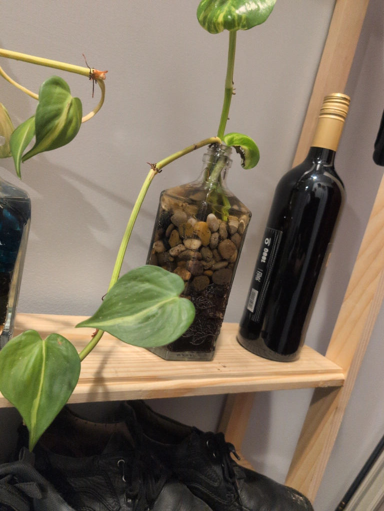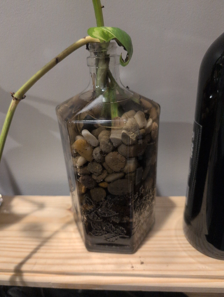Selling a healthy pothos plant in a unique decorative glass bottle filled with pebbles and water. Perfect for adding a touch of greenery to your home or office space!