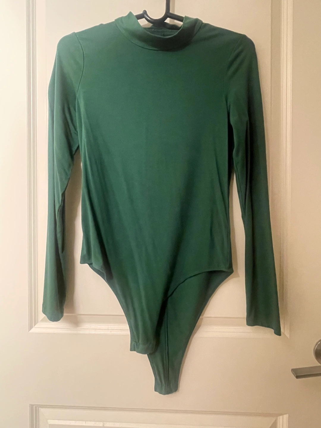 60Selling a green long sleeve bodysuit. It's in great condition and perfect for layering or wearing on its own! The color is a beautiful, rich green.