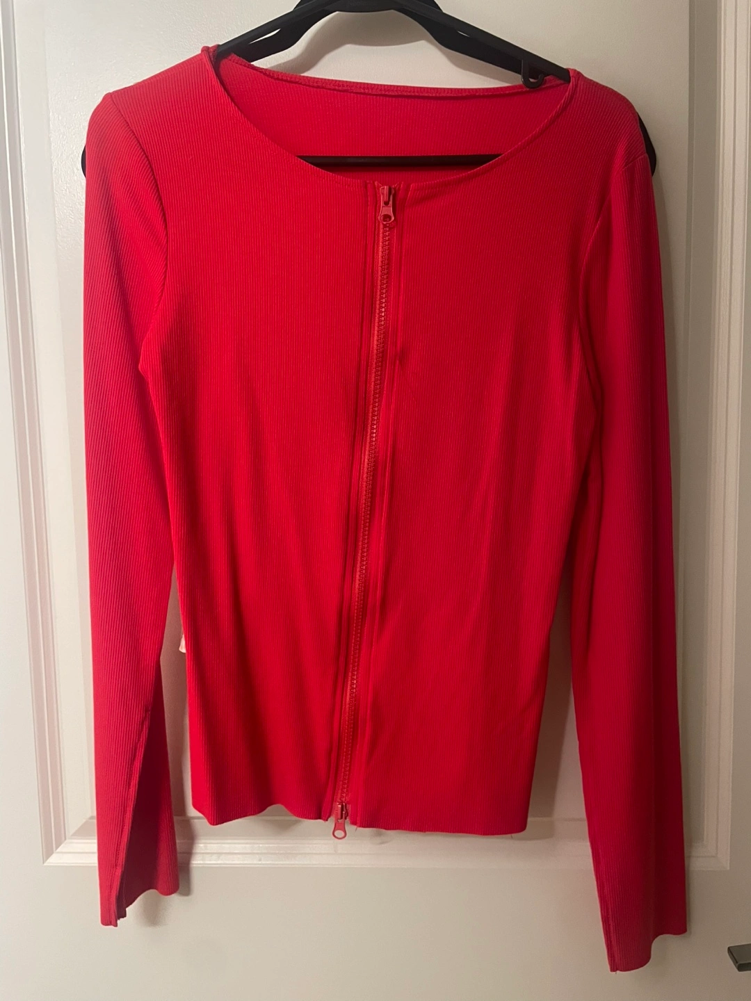 Here's a cute red long-sleeve top with a zipper down the front! It's a ribbed material and would be great for layering or wearing on its own