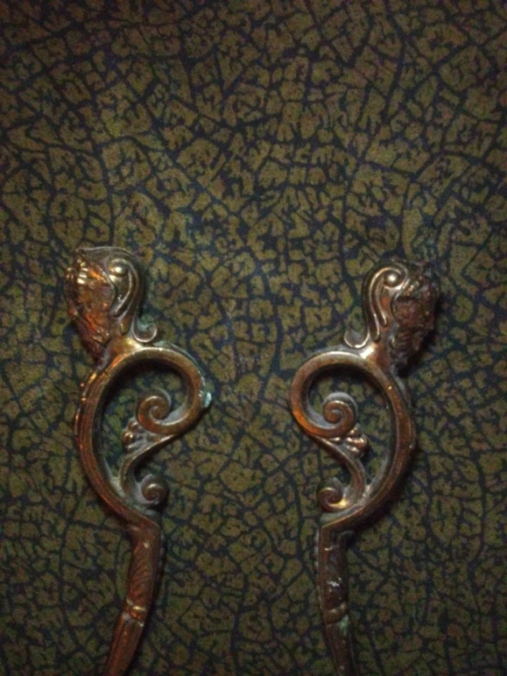These are some unique door handles with an antique bronze look. They feature a face design at the top and a curly, decorative shape. Perfect for adding a touch of vintage charm to your curtains