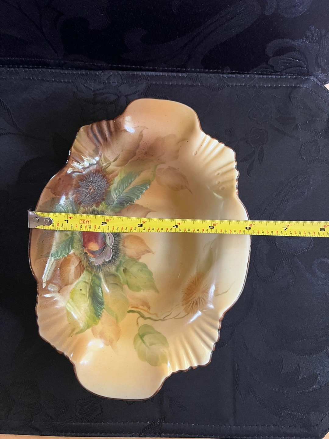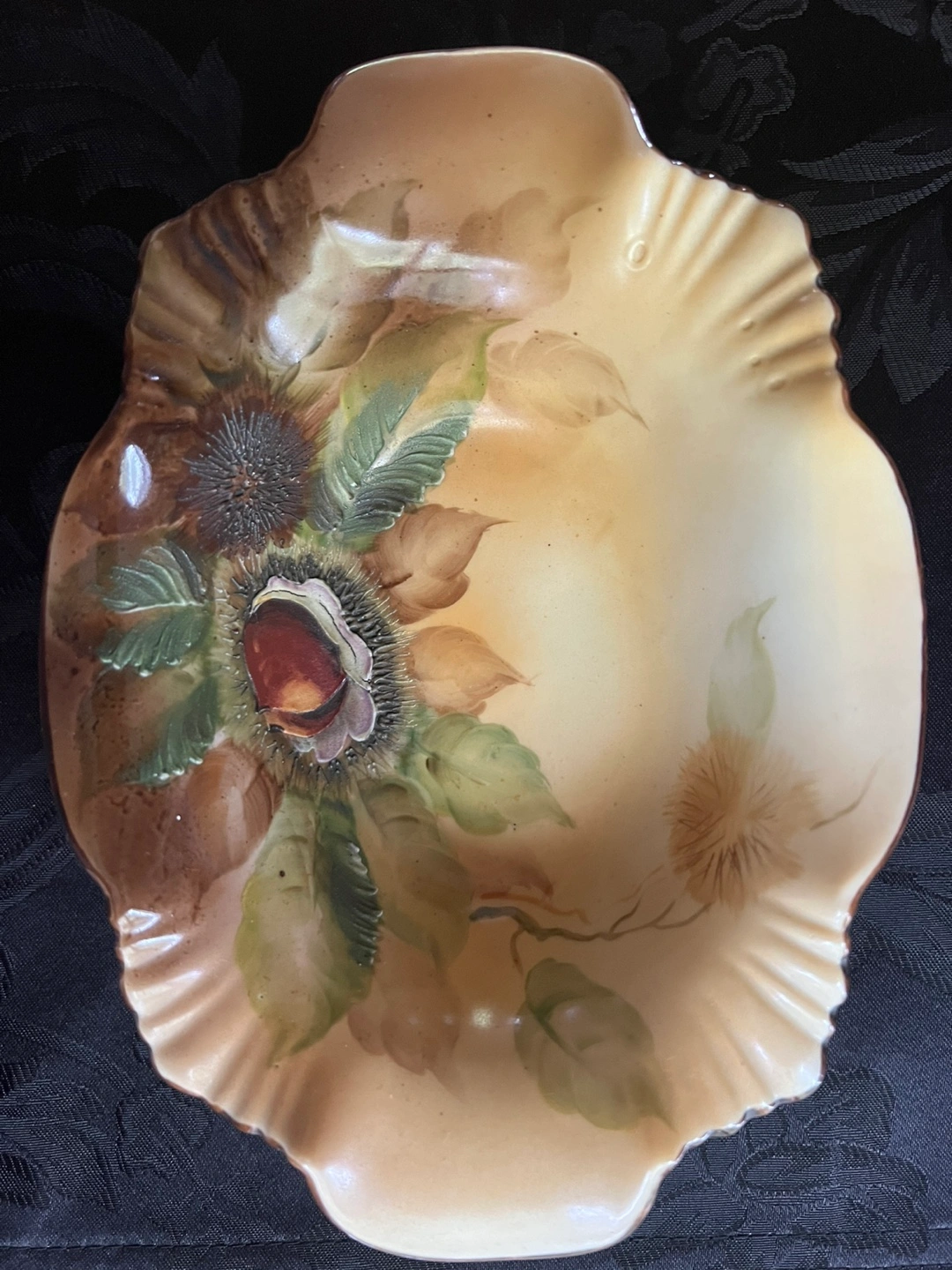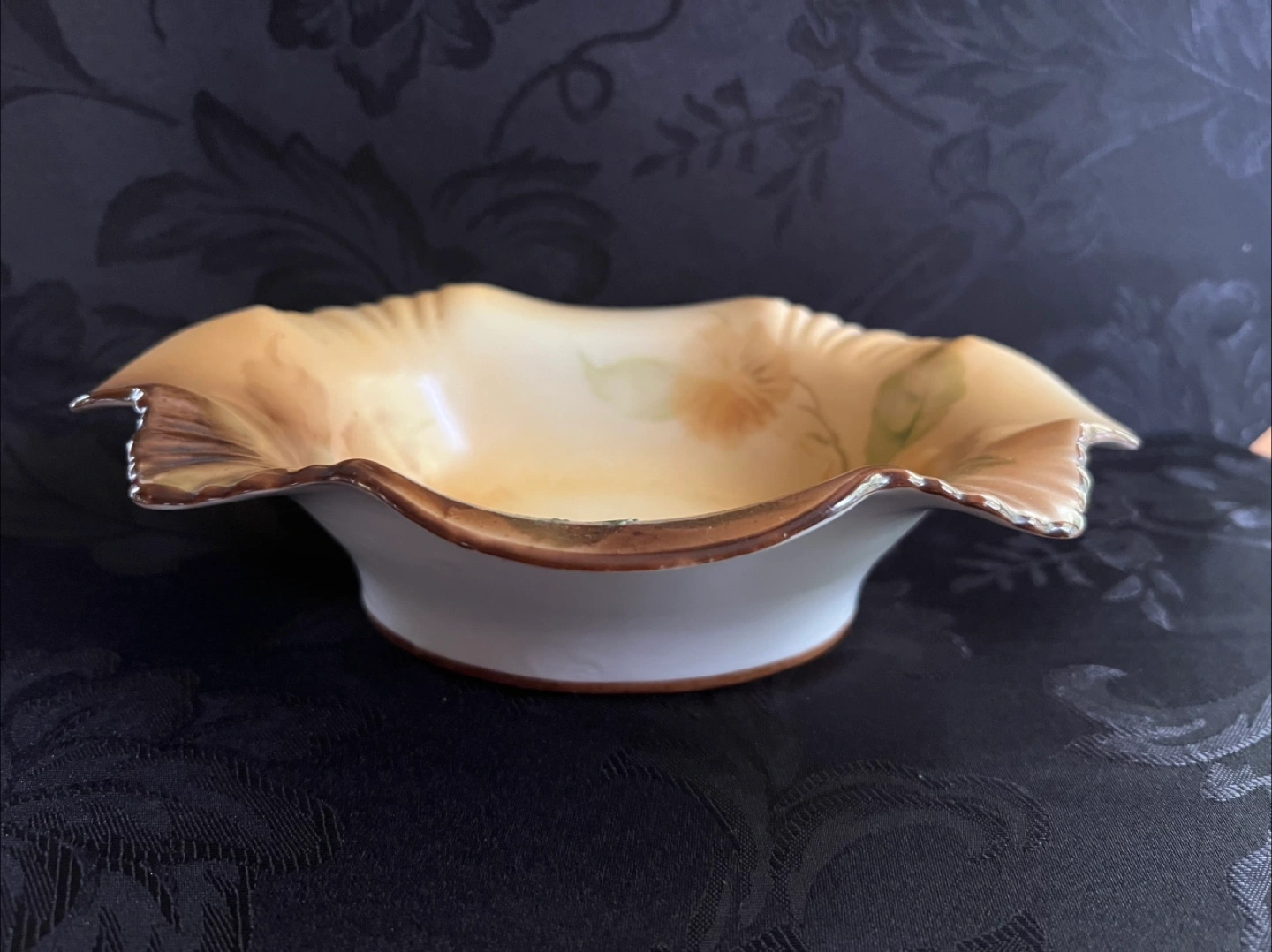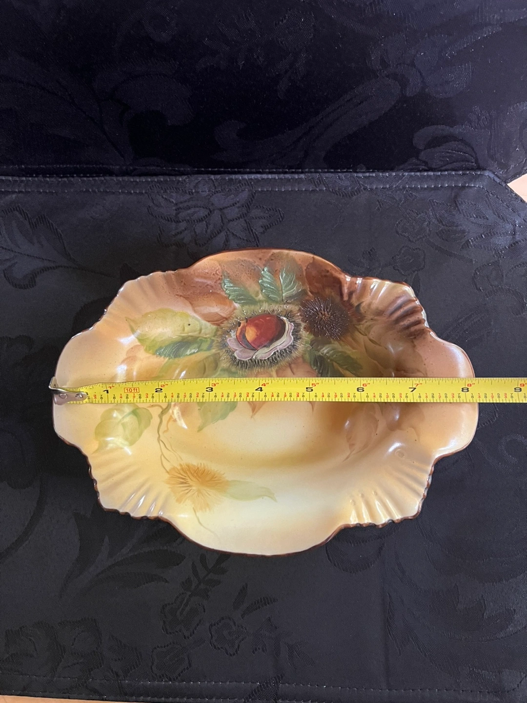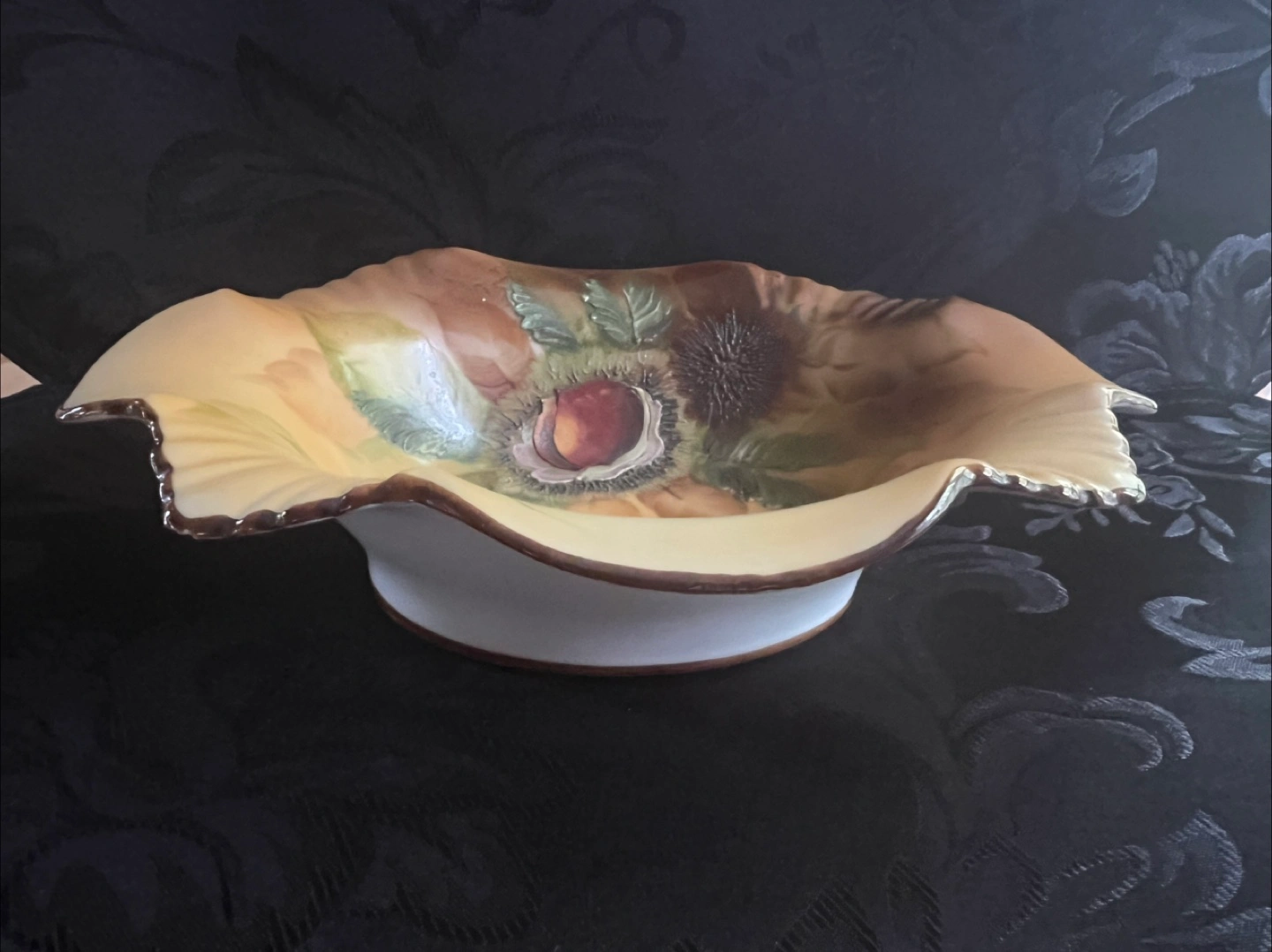 18Antique Beautiful vintage Nippon bowl with hand-painted floral and nuts design. The bowl features a ruffled edge with gold trim and a white base. Perfect for adding a touch of elegance to your home decor! Made in Japan.