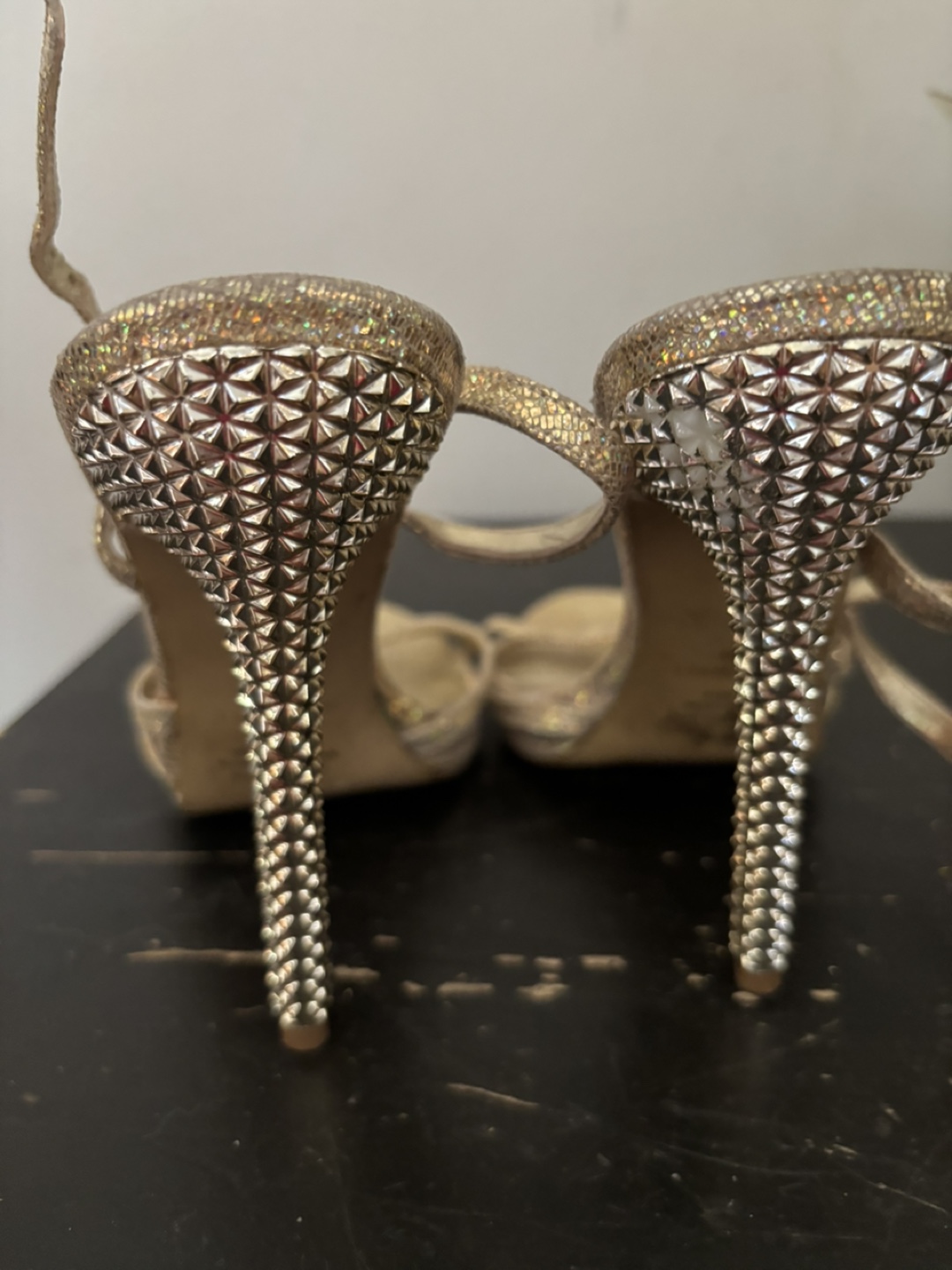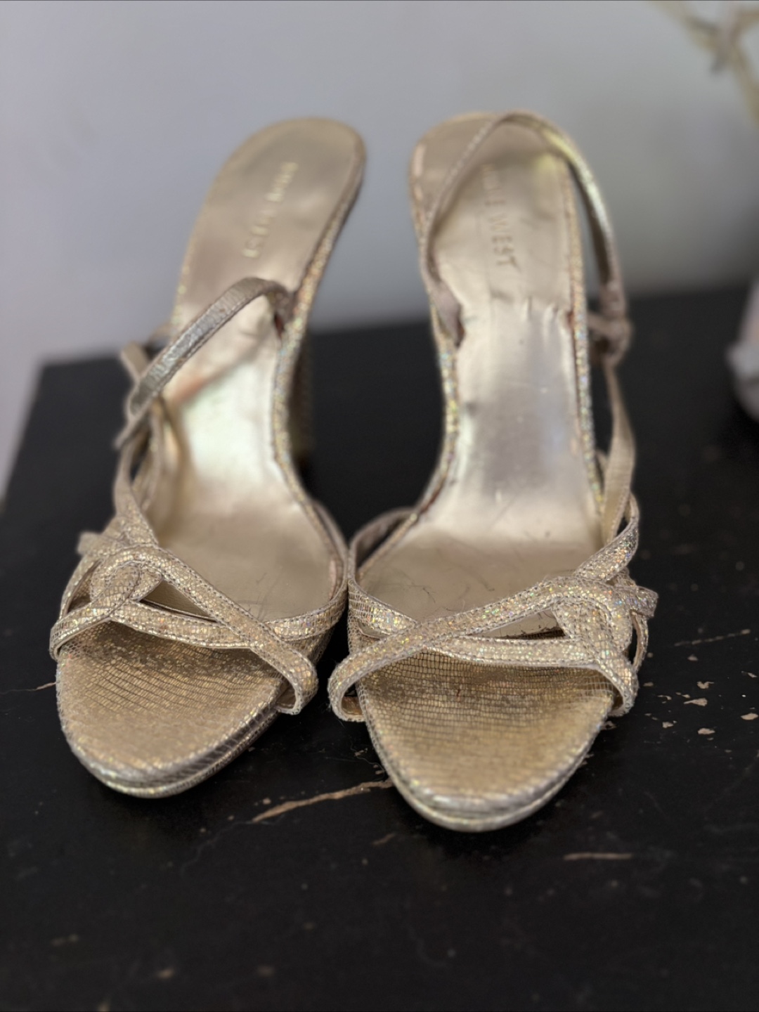 Selling a pair of Nine West heels in gold. These heels have a unique studded design on the heel. They are perfect for a night out!