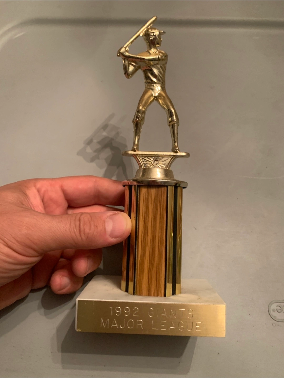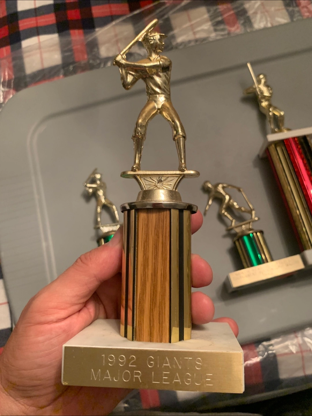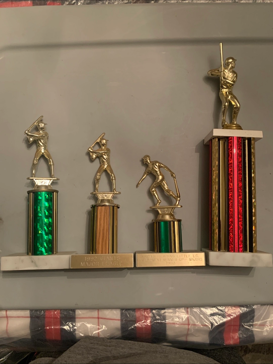 Selling a set of baseball trophies. One is marked '1992 Giants Major League', and another says 'Woburn Little League Tournament Runner Up - Majors 1992'. Great for collectors or baseball fans!