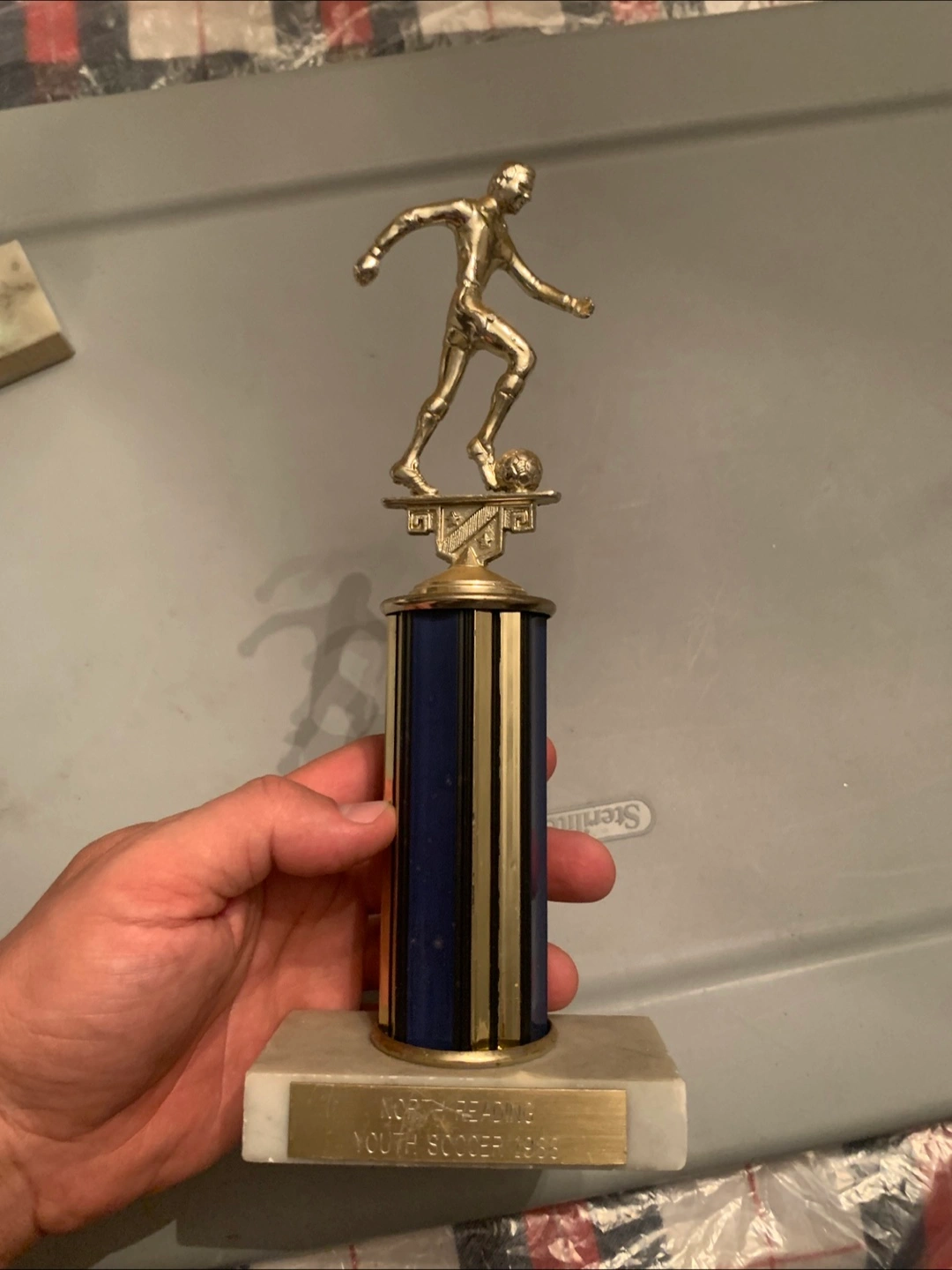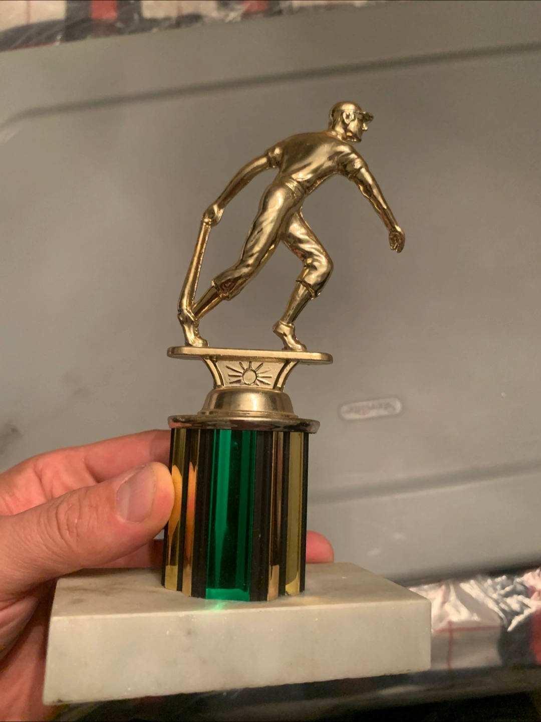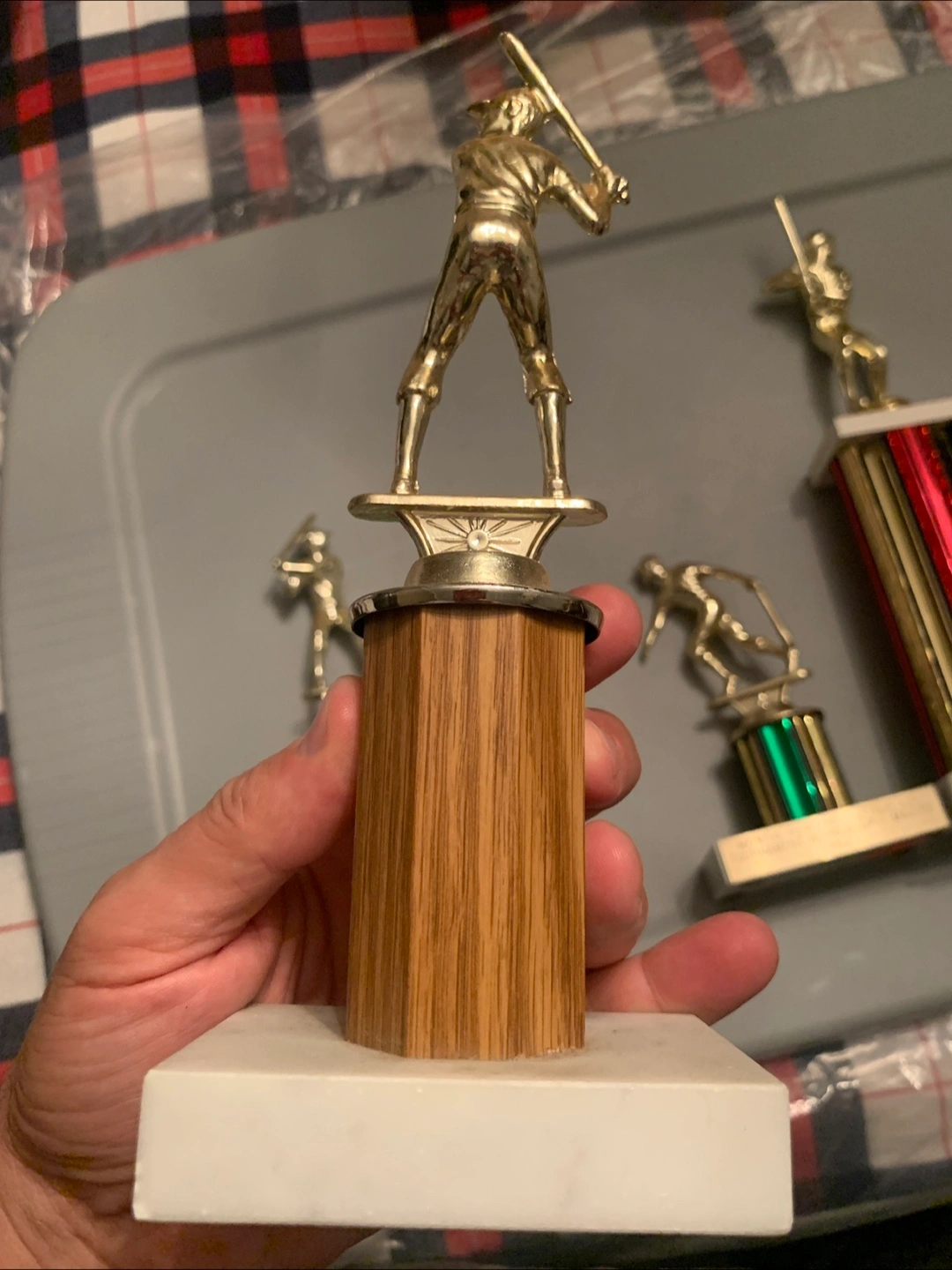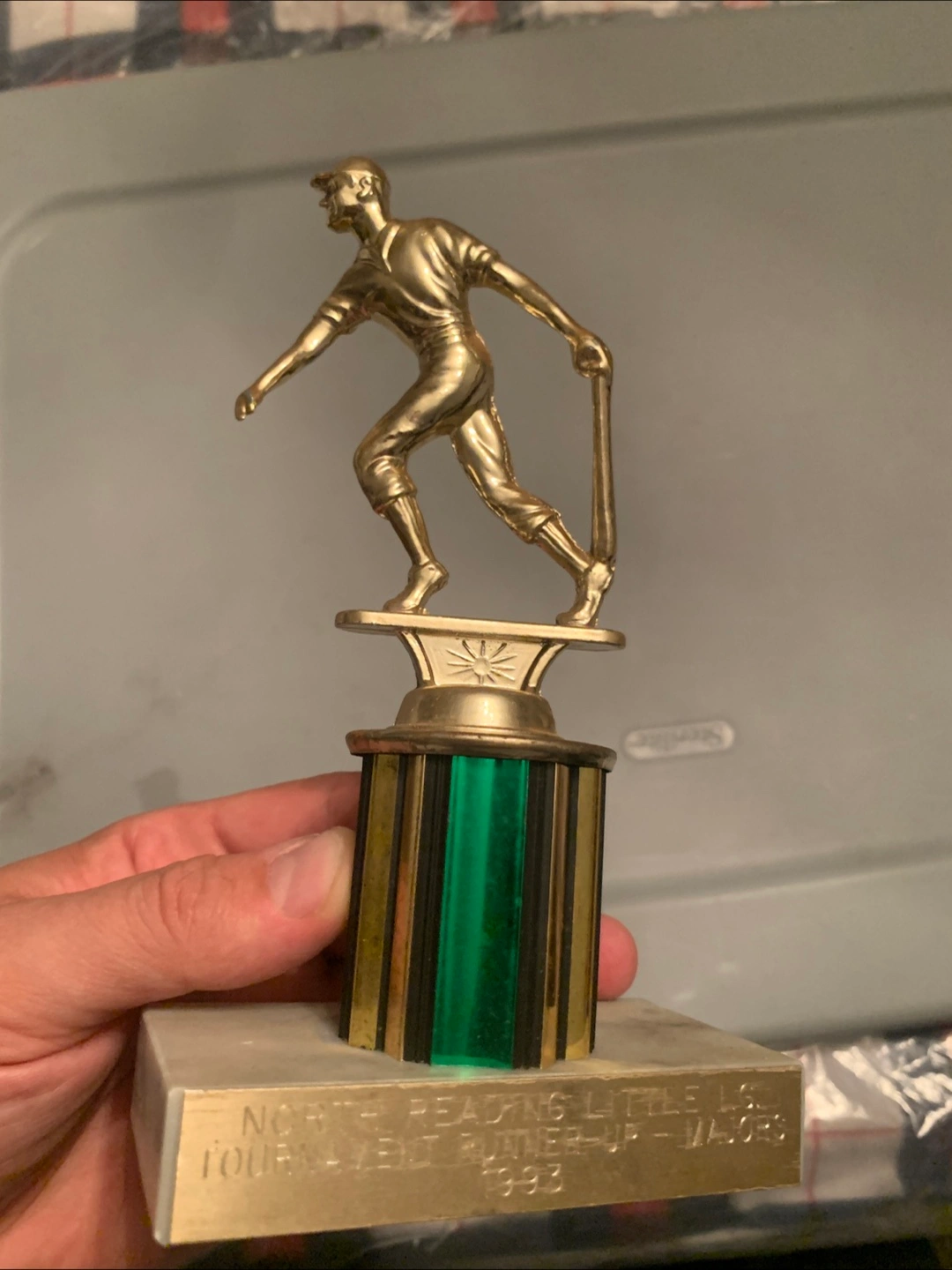 Selling a set of baseball trophies. One is marked '1992 Giants Major League', and another says 'Woburn Little League Tournament Runner Up - Majors 1992'. Great for collectors or baseball fans!