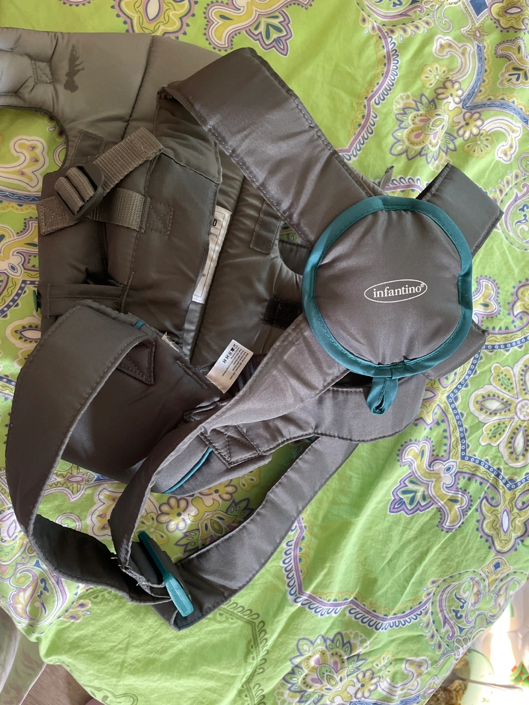 I'm selling an Infantino baby carrier in gray. It's in great condition and ready for a new home! It's perfect for keeping your little one close and comfortable while you're on the go. It’s been never used.