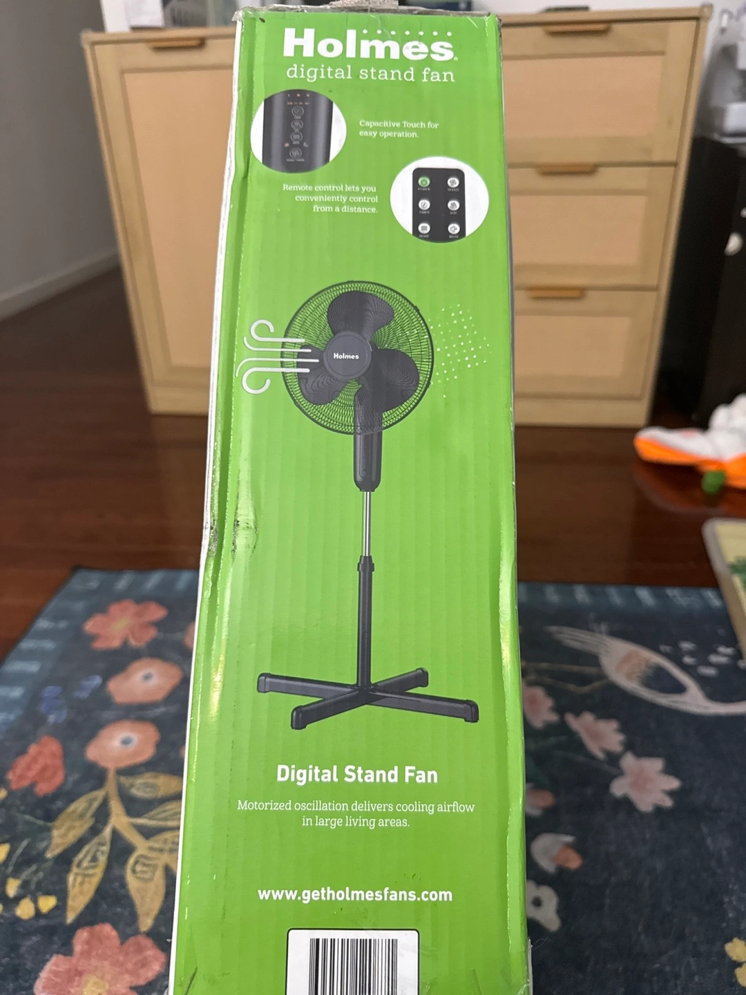 Selling a Holmes 16" digital stand fan! It has: - Remote control - 3 speeds - 3 modes - Adjustable height, up to 44" - Timer up to 7.5 hours - Adjustable head tilt - Oscillation with wide angle