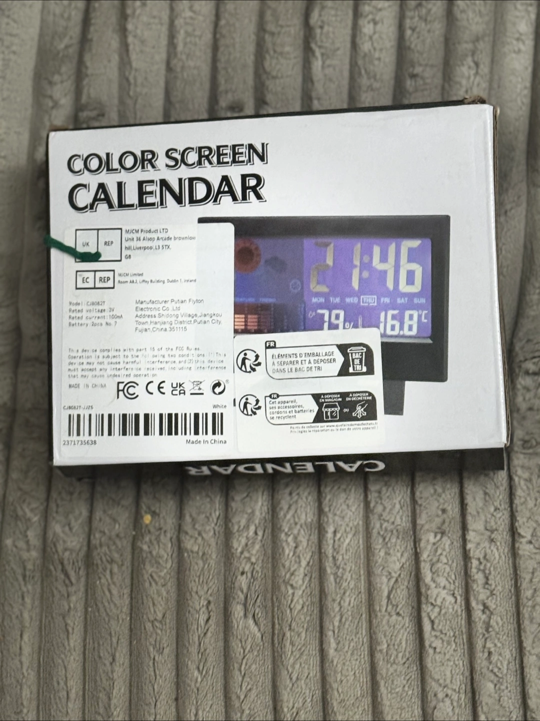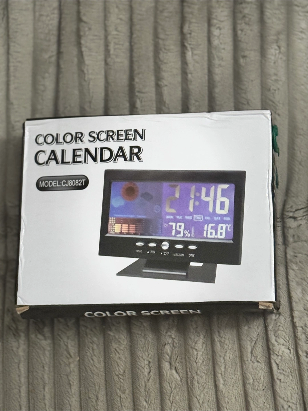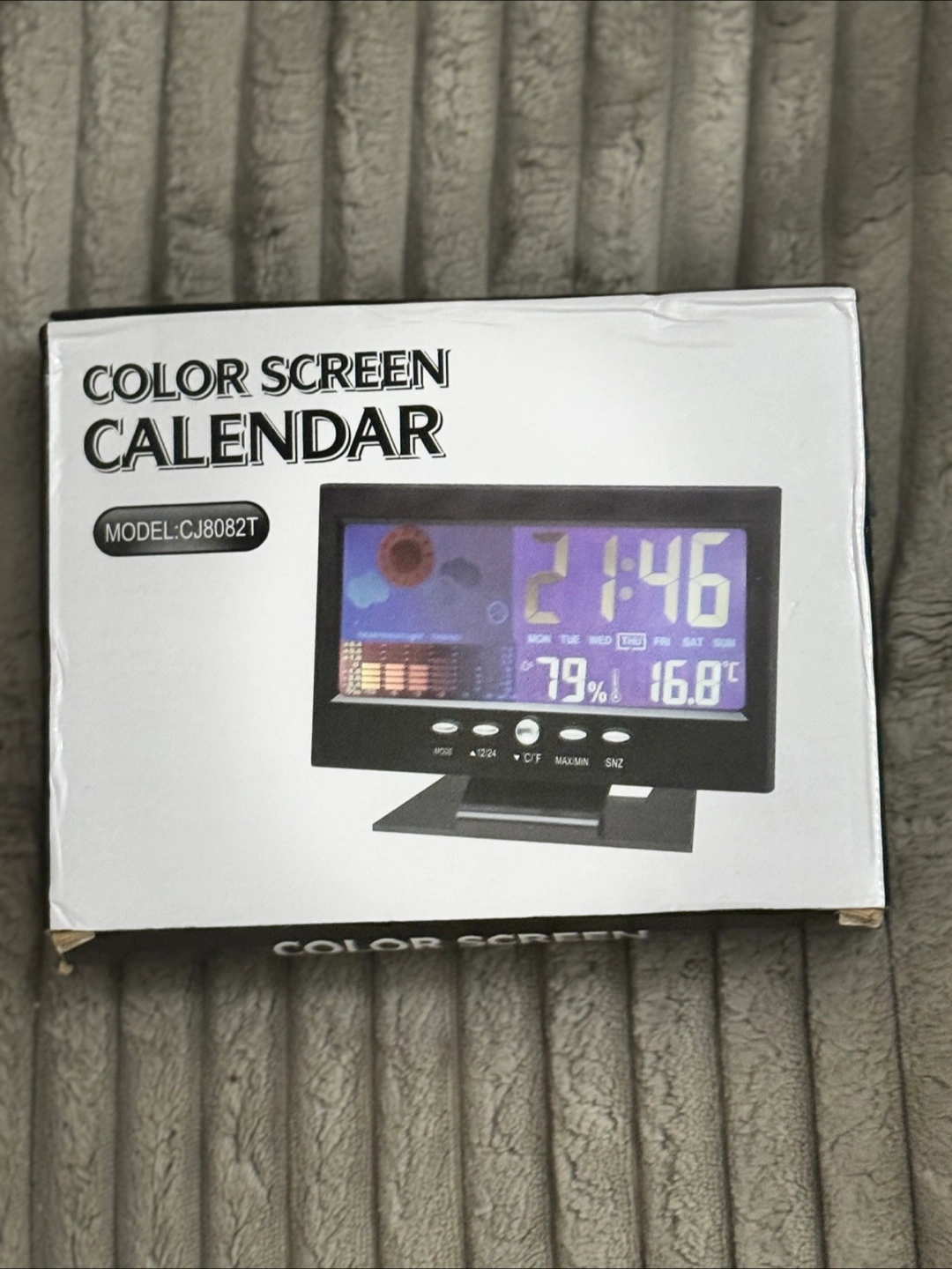 103Selling a new color screen calendar clock, still in its original packaging! Features include: - Temperature display - Humidity display - Time display (12/24 hour format) - Alarm - Date display Model number is CJ8082T Available for local pickup by Schaumburg and Barrington Road in Schaumburg IL 60194 or shipping to your doorstep for one low price with tracking included for free. Comes from a virus free, smoke free and pet free home.