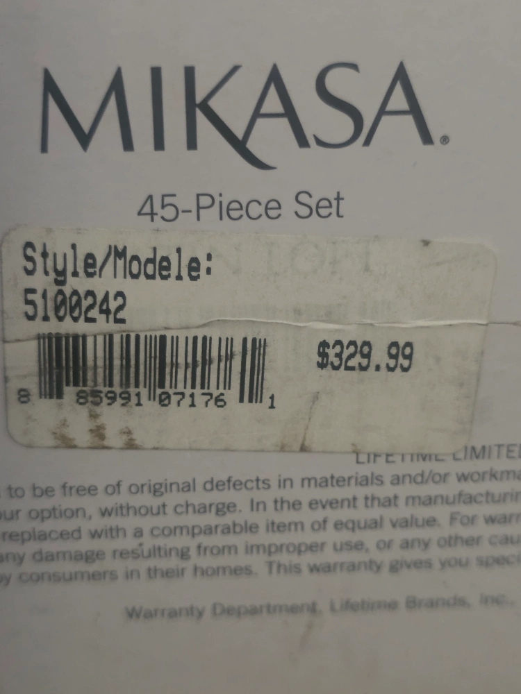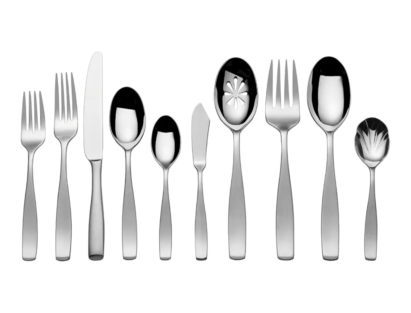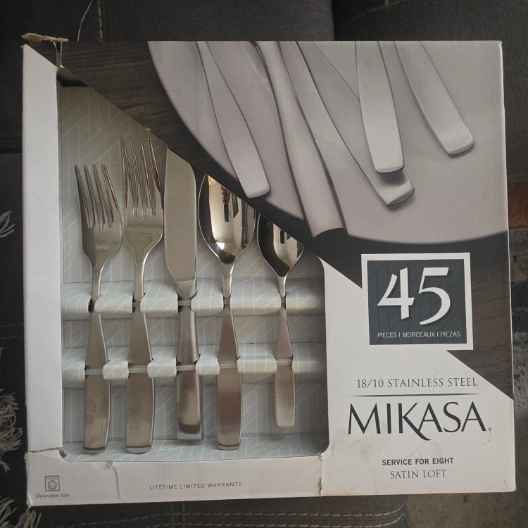 259Brand New Mikasa Satin Loft 45-piece flatware set. This set is a service for eight and includes: - Serving fork - Spreader - Serving spoon - Condiment spoon - Slotted serving spoon It is made of 18/10 stainless steel and originally retailed for $329.99 Pick up at Yonge and Steeles