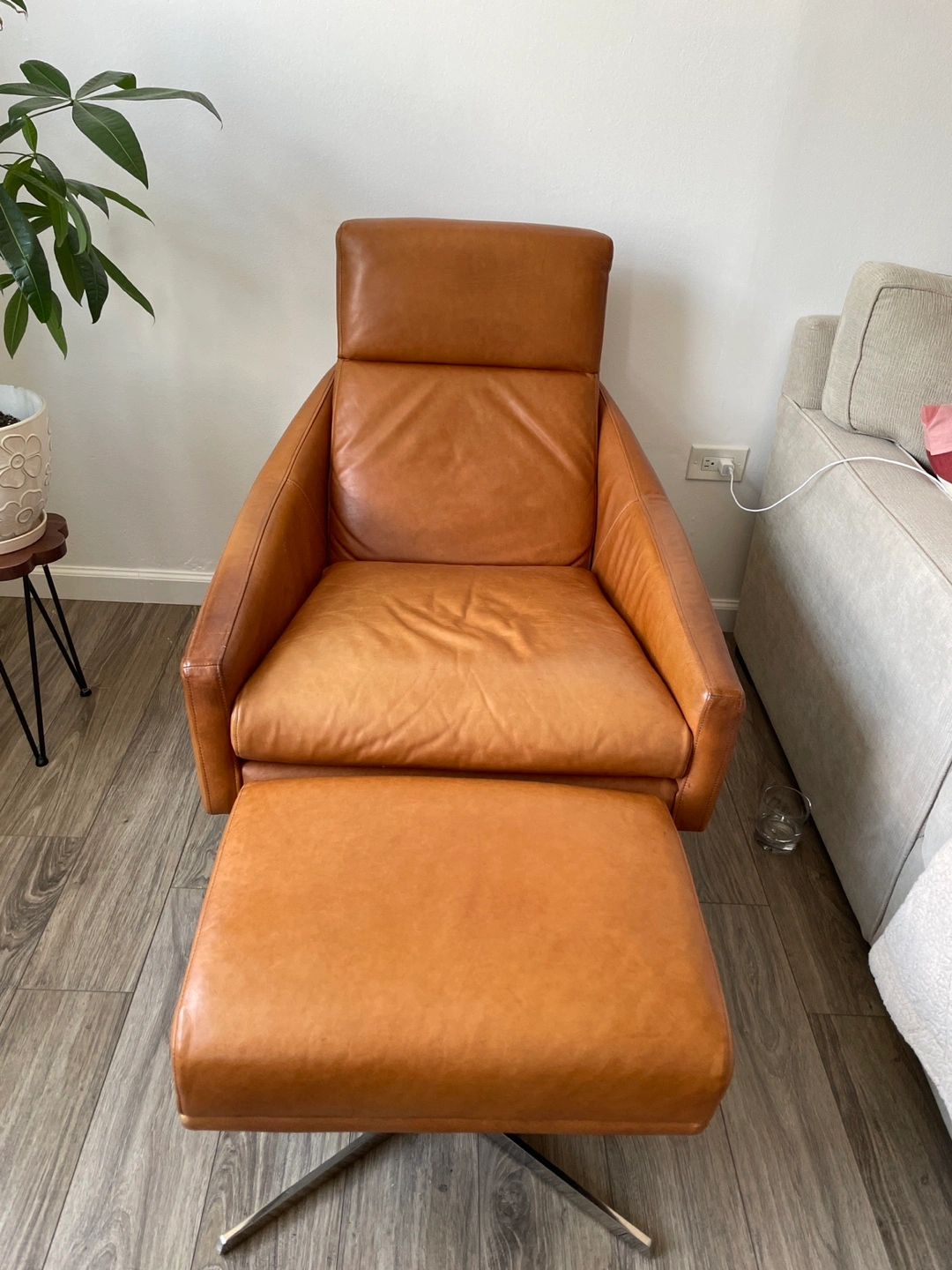 Selling a stylish leather swivel chair with a matching ottoman. It's a great addition to any living space! The chair shows minimal signs of wear, as seen in the photos, but it's still very comfortable and functional. Perfect for relaxing after a long day