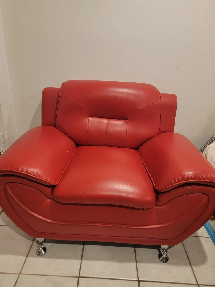 48Selling a red leather armchair. It's in good condition and ready for a new home! The chair features a comfortable design with a sturdy frame and stylish chrome legs. Perfect for adding a pop of color to your living room or study