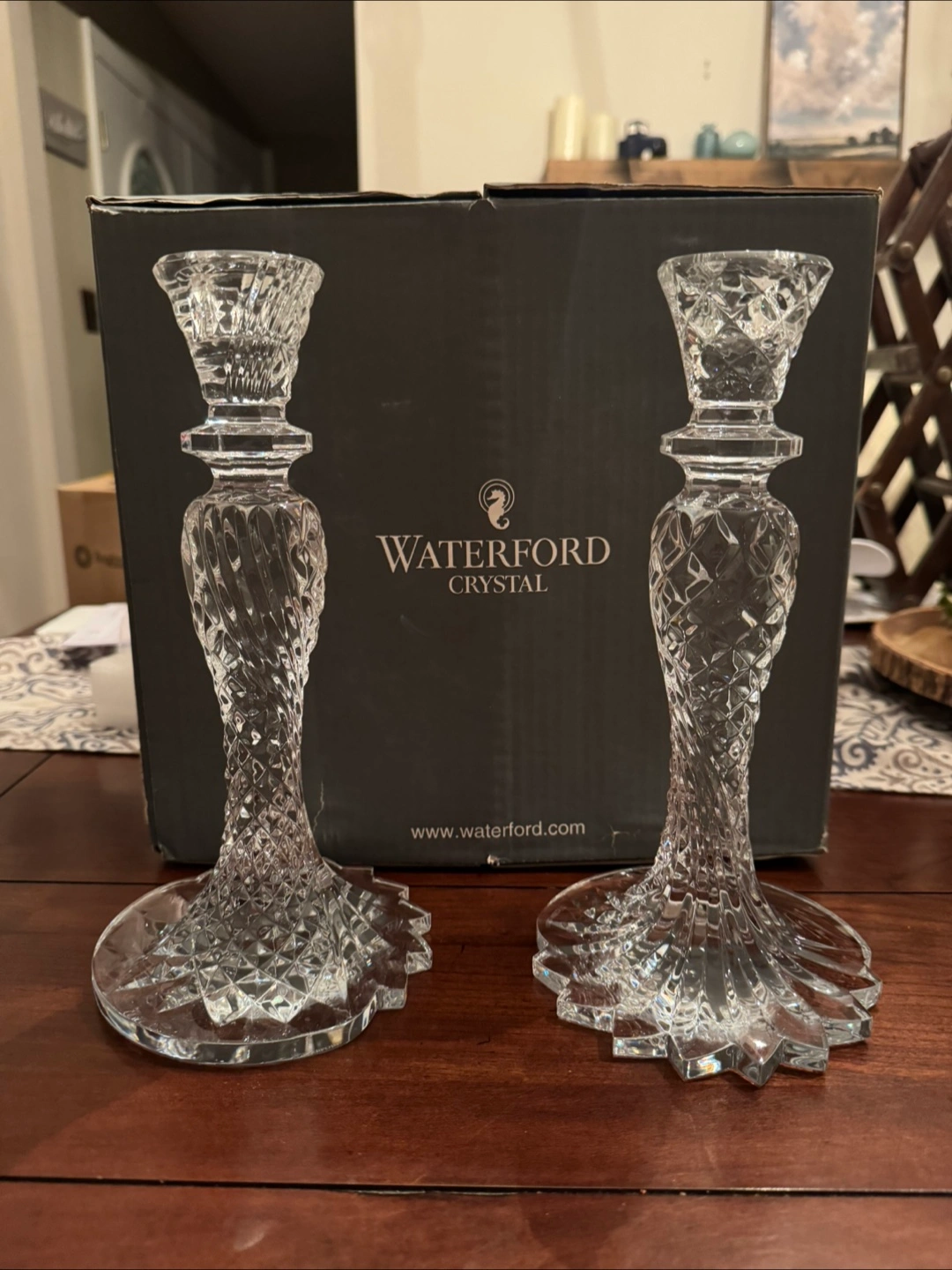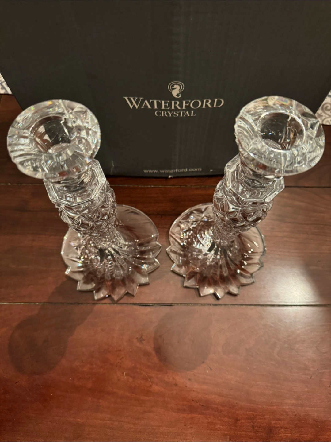 89The Waterford Crystal SEA JEWEL Candlestick Pair stands at 10 inches tall, showcasing the brand's signature elegance and craftsmanship. Made from clear crystal, these candlesticks add a touch of sophistication to any room with their beautiful and intricate design. Perfect for adding a touch of ambiance to any space, these candlesticks are a timeless and classic addition to any home decor. In great condition Have another pair available if interested