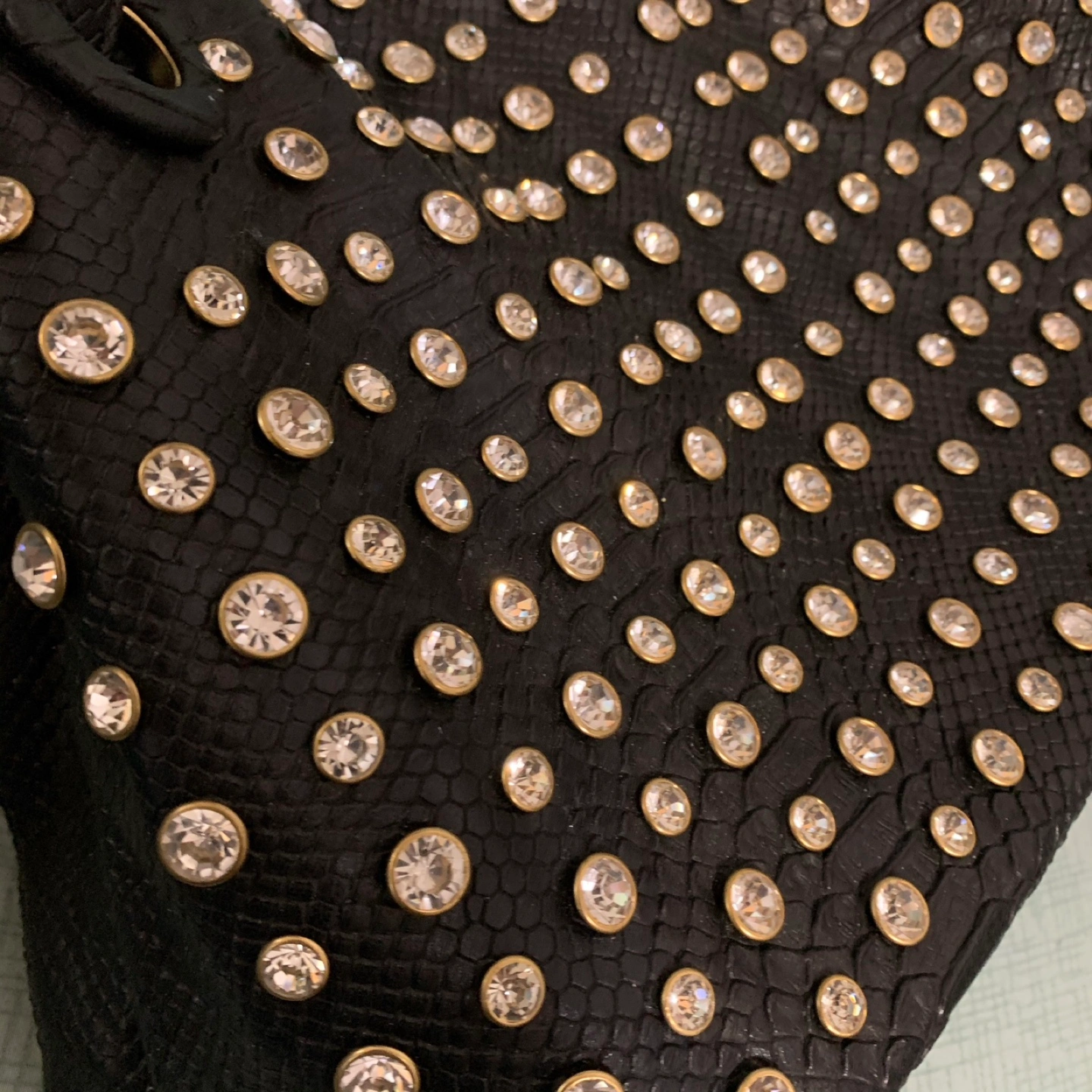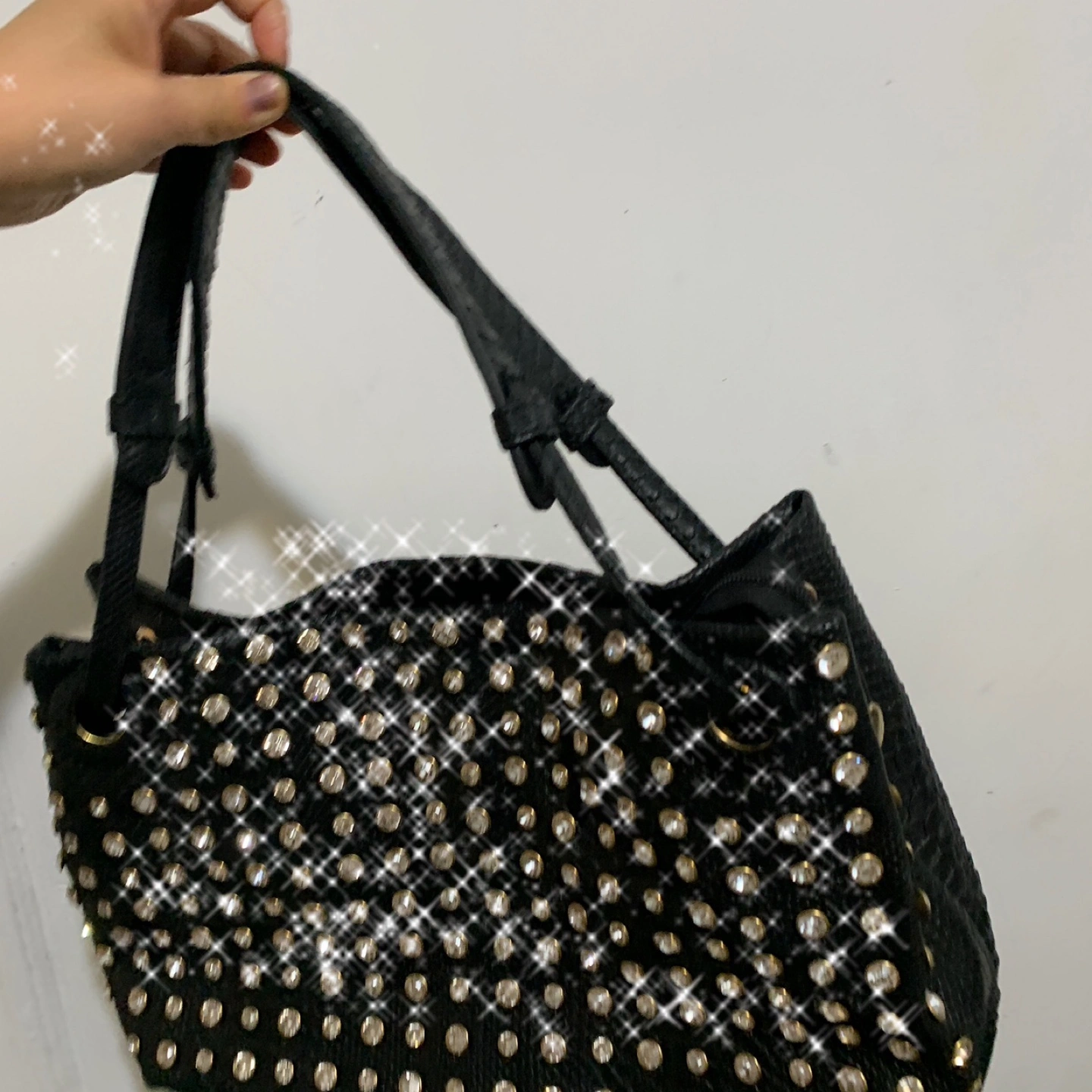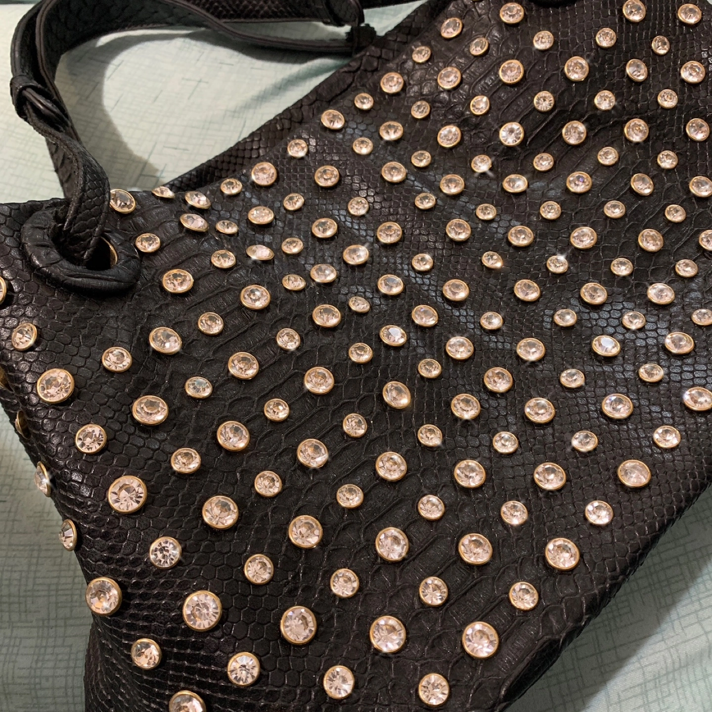 This black shoulder bag features a unique snakeskin pattern and is embellished with rhinestones. It's perfect for adding a touch of sparkle to any outfit! Purchased the boutique store near Nayak. Too much blings for me, so i am selling : completely NEW