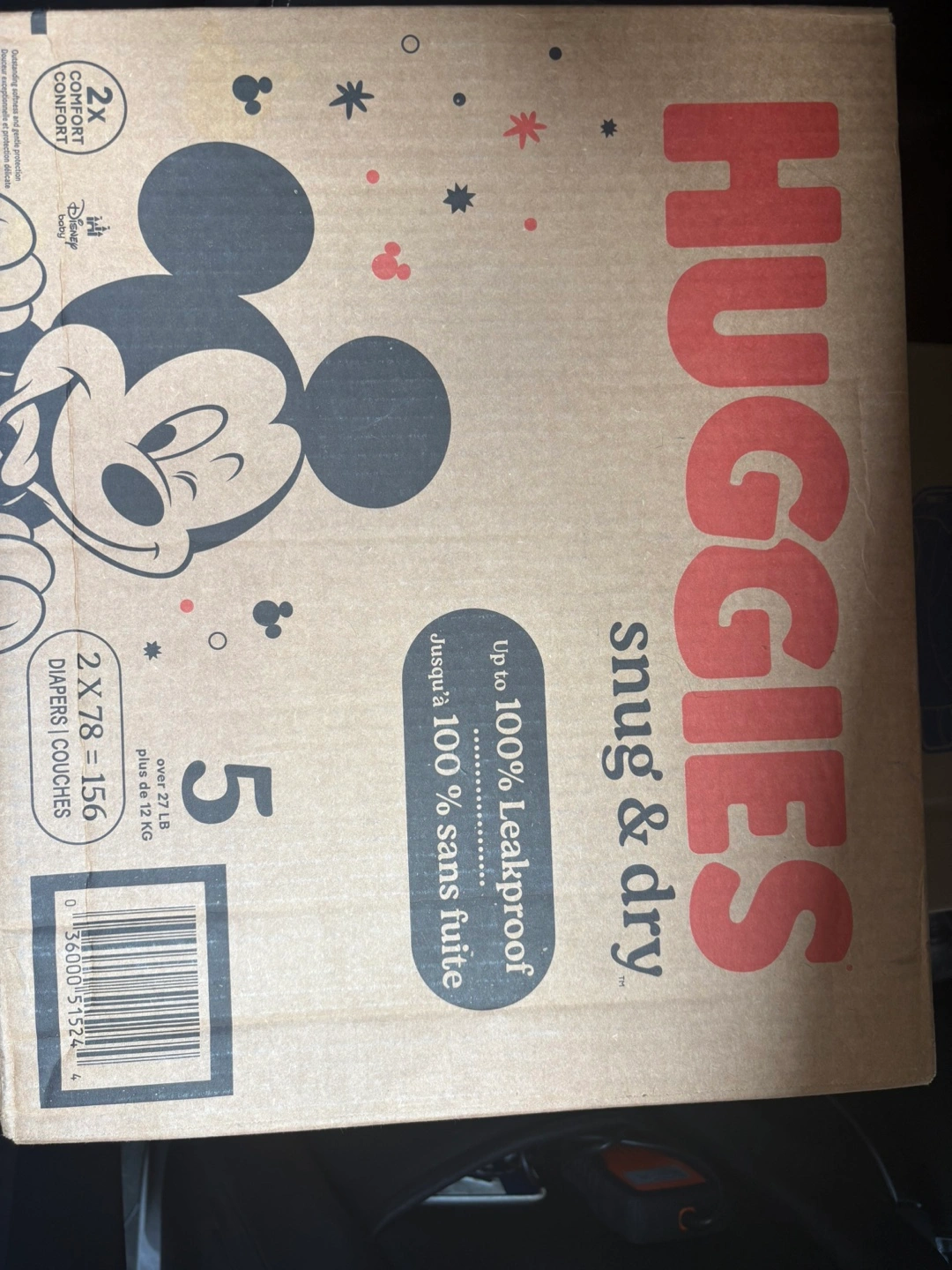 Selling a box of Huggies Snug & Dry diapers, size 5! The box contains 156 diapers, perfect for babies over 27 lbs or 12 kg. These diapers offer up to 100% leakproof protection to keep your little one dry and comfortable. The box also features a cute Mickey Mouse design!