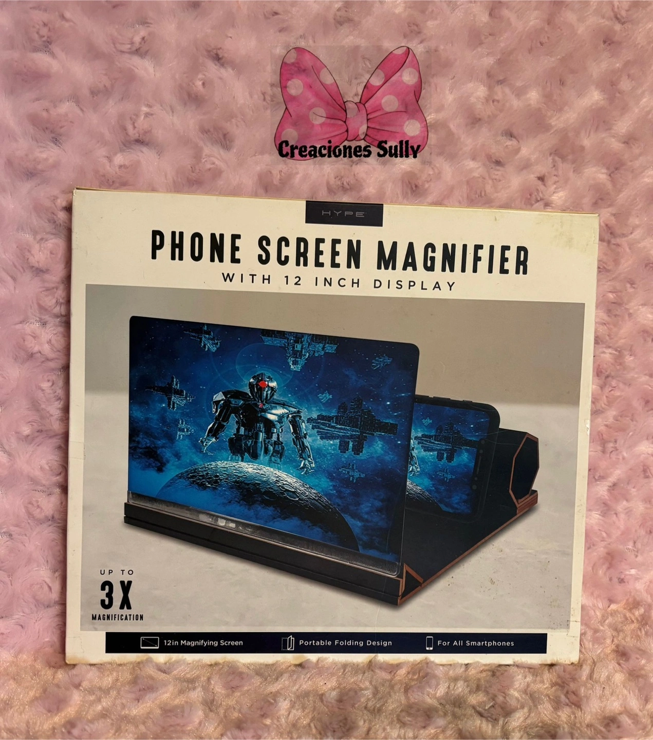 Selling a Hype phone screen magnifier with a 12-inch display. It's designed to magnify your phone screen up to 3x, making it easier to watch videos or view content. It features a portable folding design and is compatible with all smartphones
