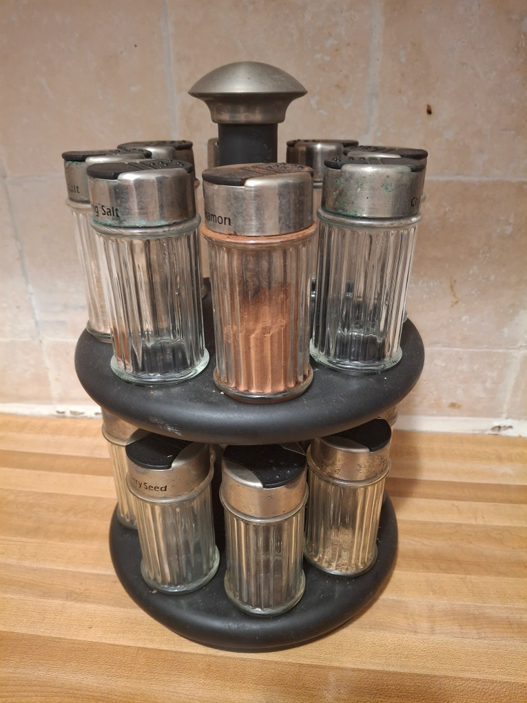 Spice rack with jars included! The jars have labels for different spices such as 'Garlic Salt', 'Cinnamon', and 'Celery Seed'.