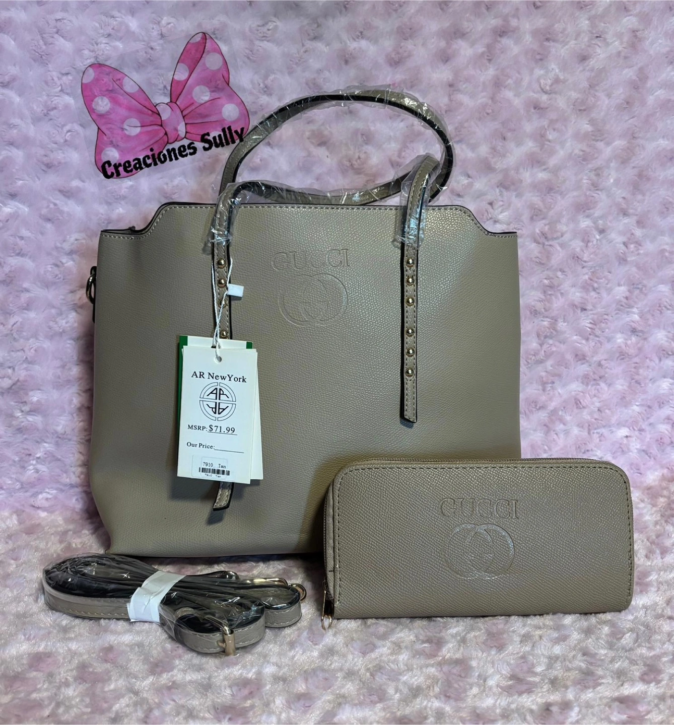 Selling a cute tote bag and wallet set! The bag has a Gucci-inspired design and comes with a detachable shoulder strap. The set is from AR New York. The tag shows an MSRP of $71.99. It's a stylish set for everyday use!