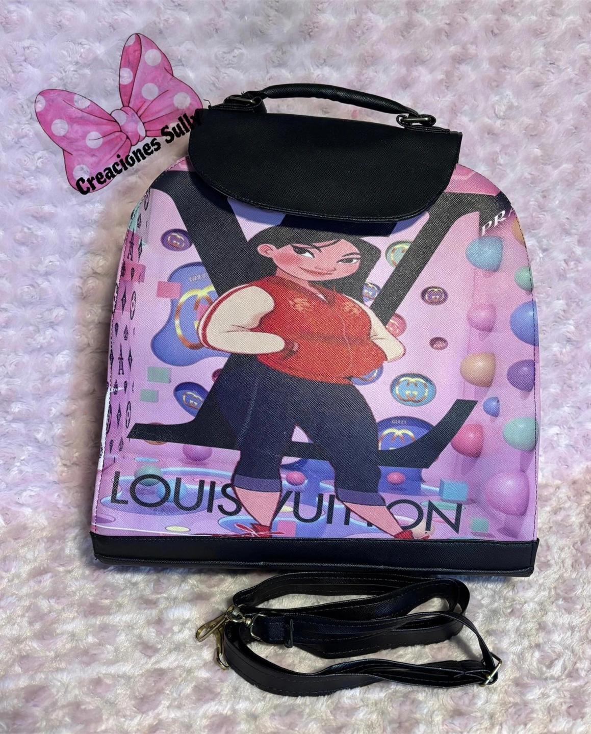Cute Louis Vuitton inspired backpack with a Mulan design! It has a black handle and flap, with a shoulder strap included
