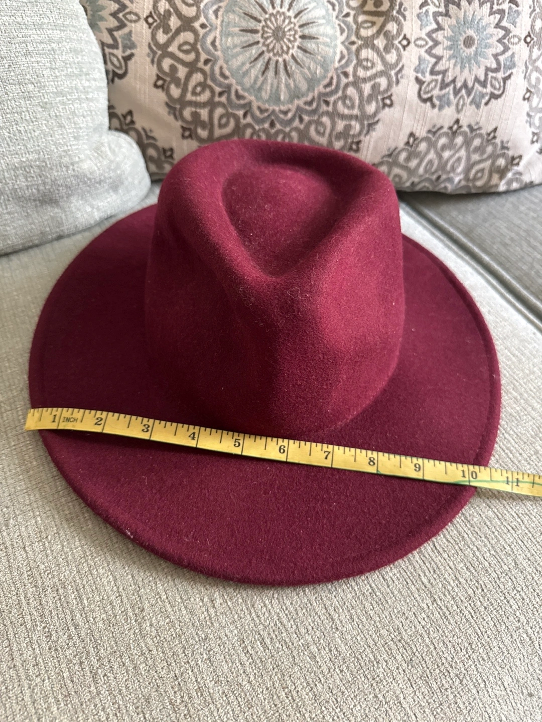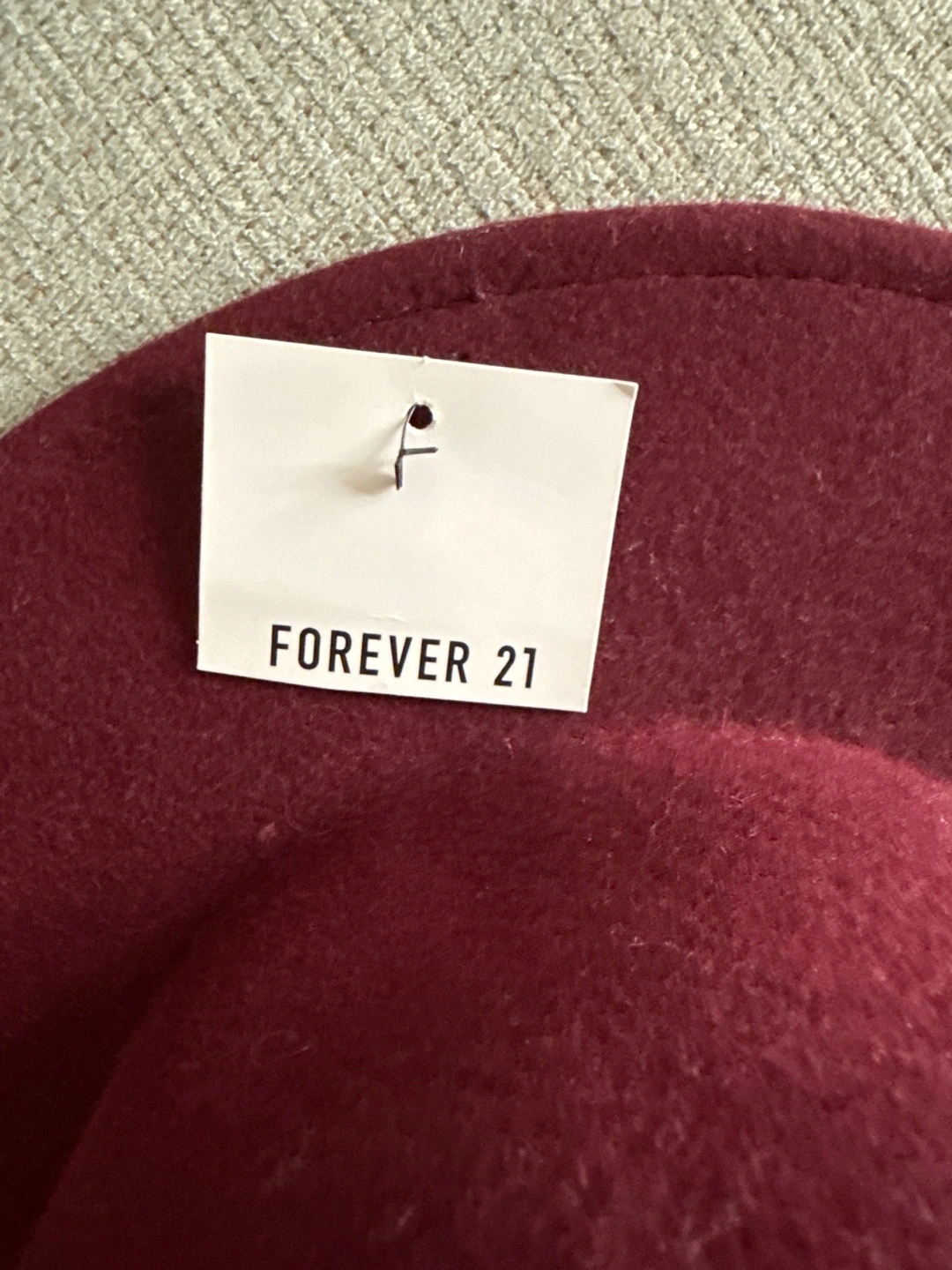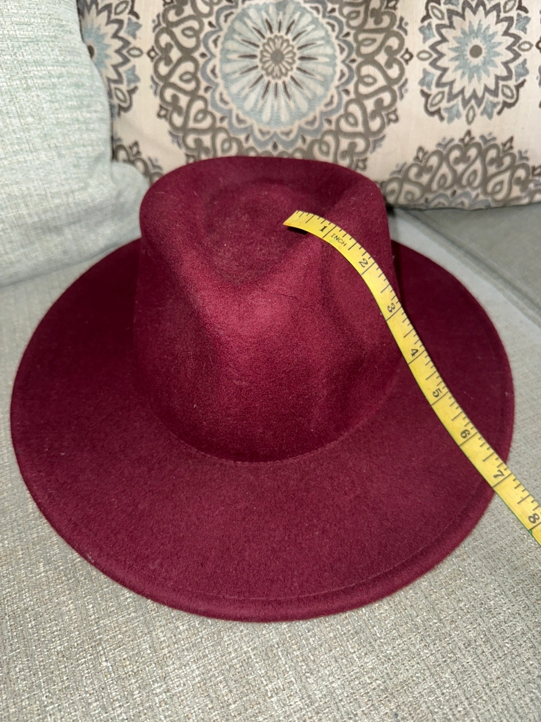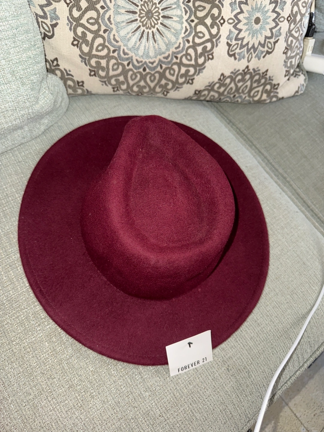 Selling a stylish burgundy fedora from Forever 21! It's in great shape and measures about 11 inches across the brim. Perfect for adding a touch of flair to any outfit. The size is approximately 7 1/4