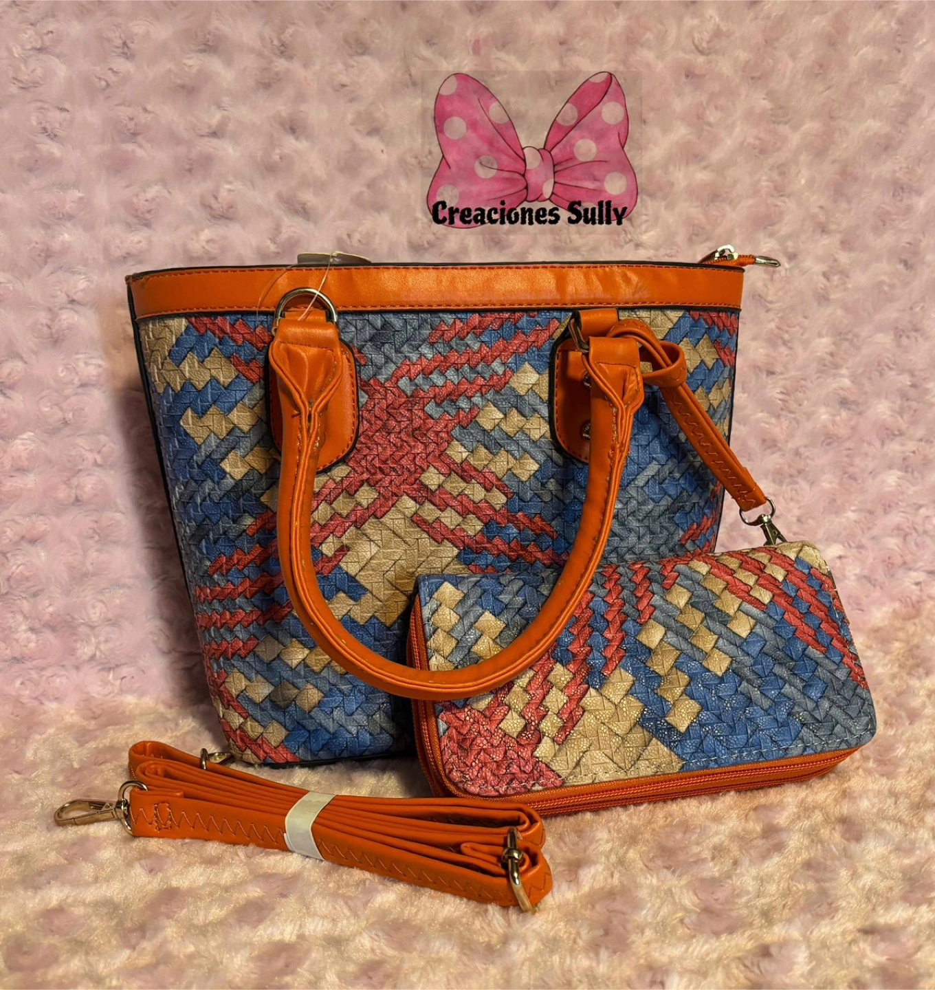 Selling a handbag with a unique woven pattern in blue, red, and beige tones, complemented by bright orange accents. It comes with a matching small wallet and a detachable shoulder strap, offering versatility in carrying options
