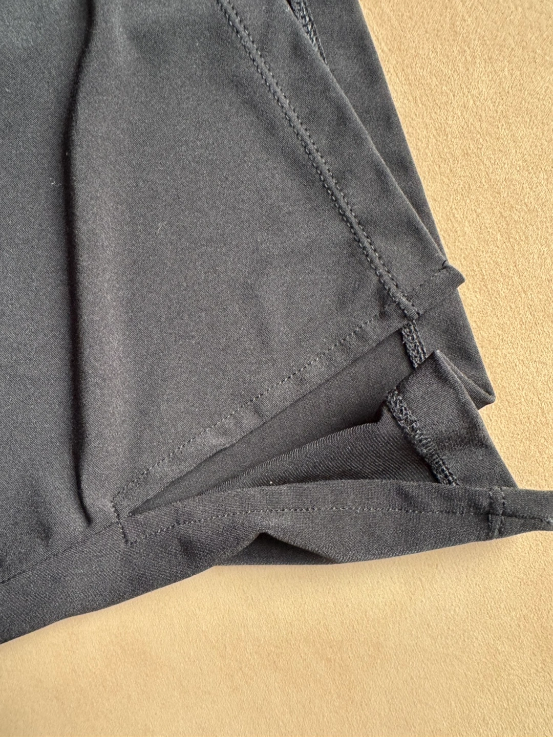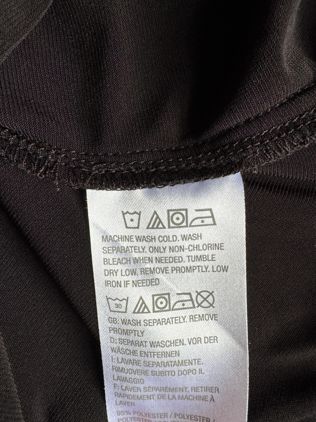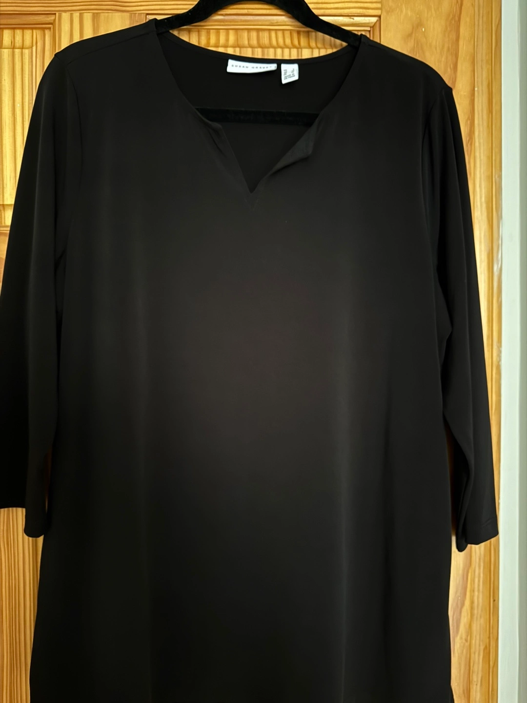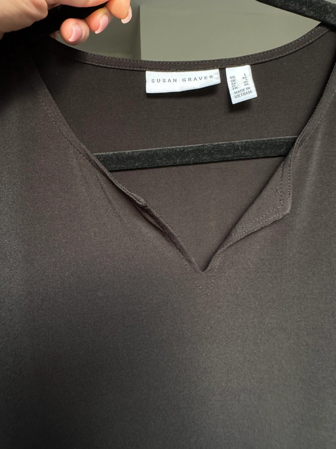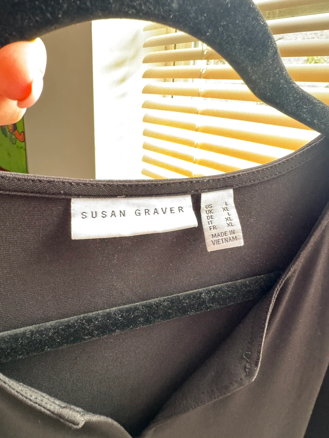 Here's a Susan Graver top in size L! It's a sleek black color and made of 95% polyester and 5% spandex. It can be machine washed cold separately, tumble dried low, and ironed if needed