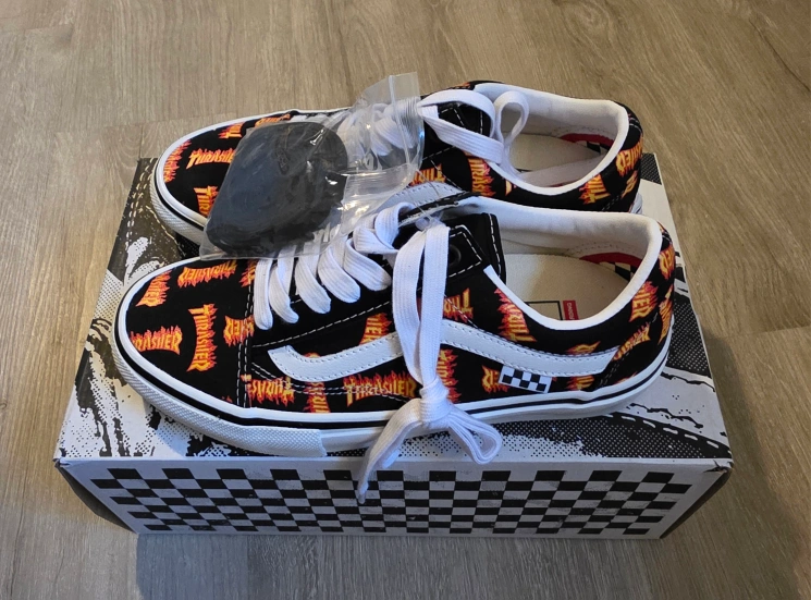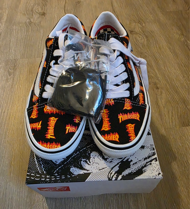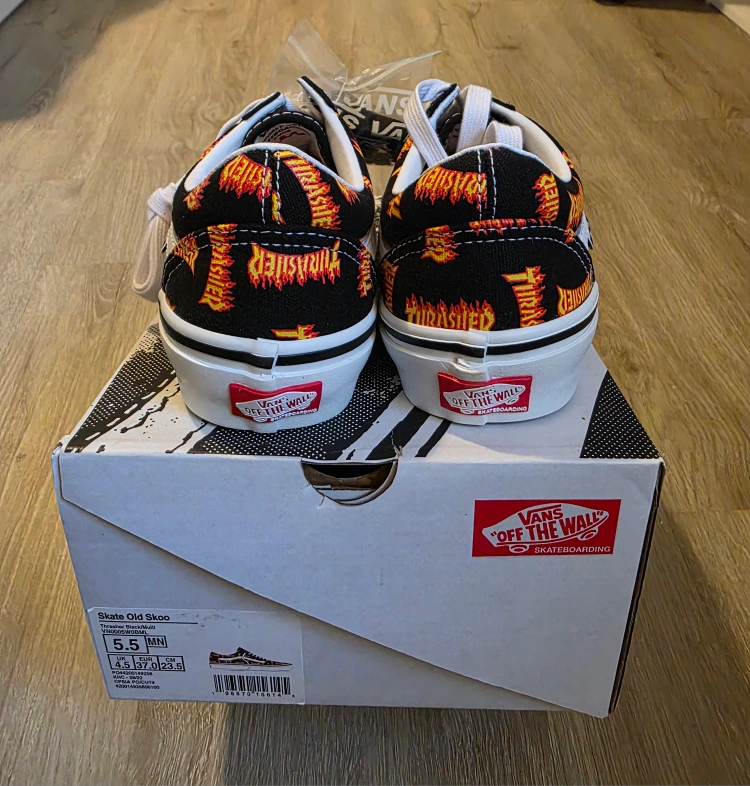Vans x Thrasher Skate Old Skool shoes! They're in great condition and come with the original box and an extra pair of black laces. The size is 5.5 in men's. Pick up at Flushing or Bayside somethime Brooklyn. Payment Zelle, Venmo or cash.