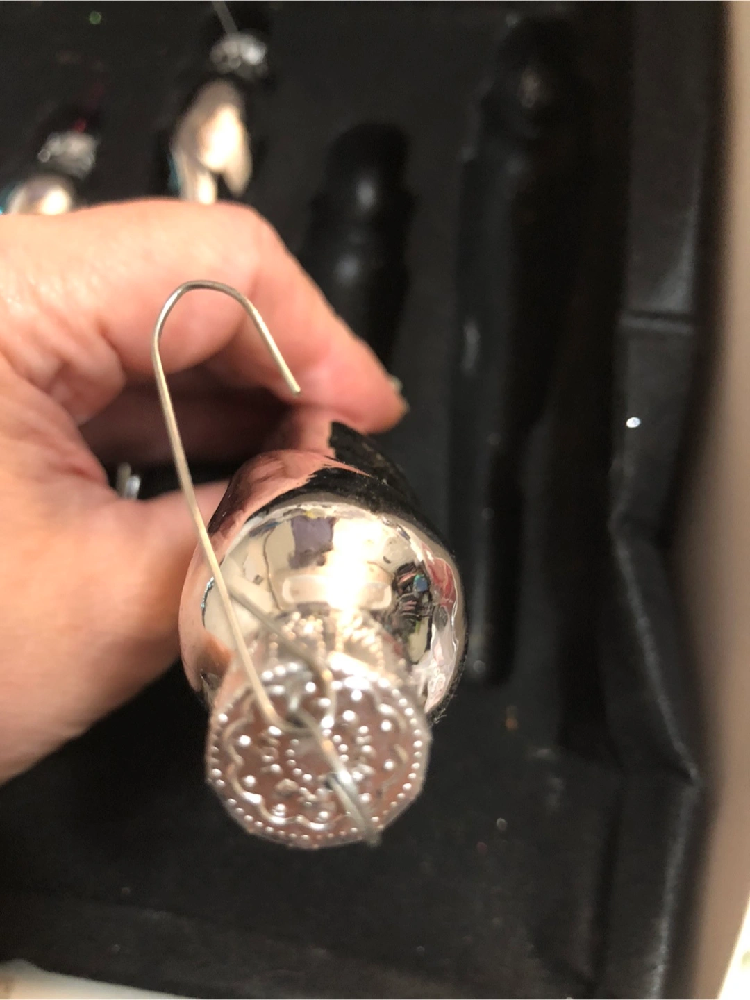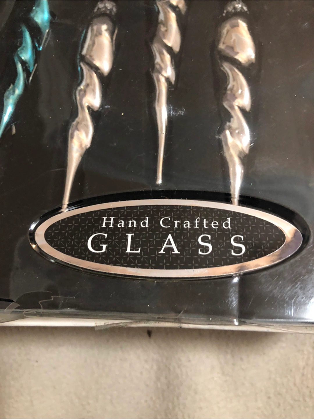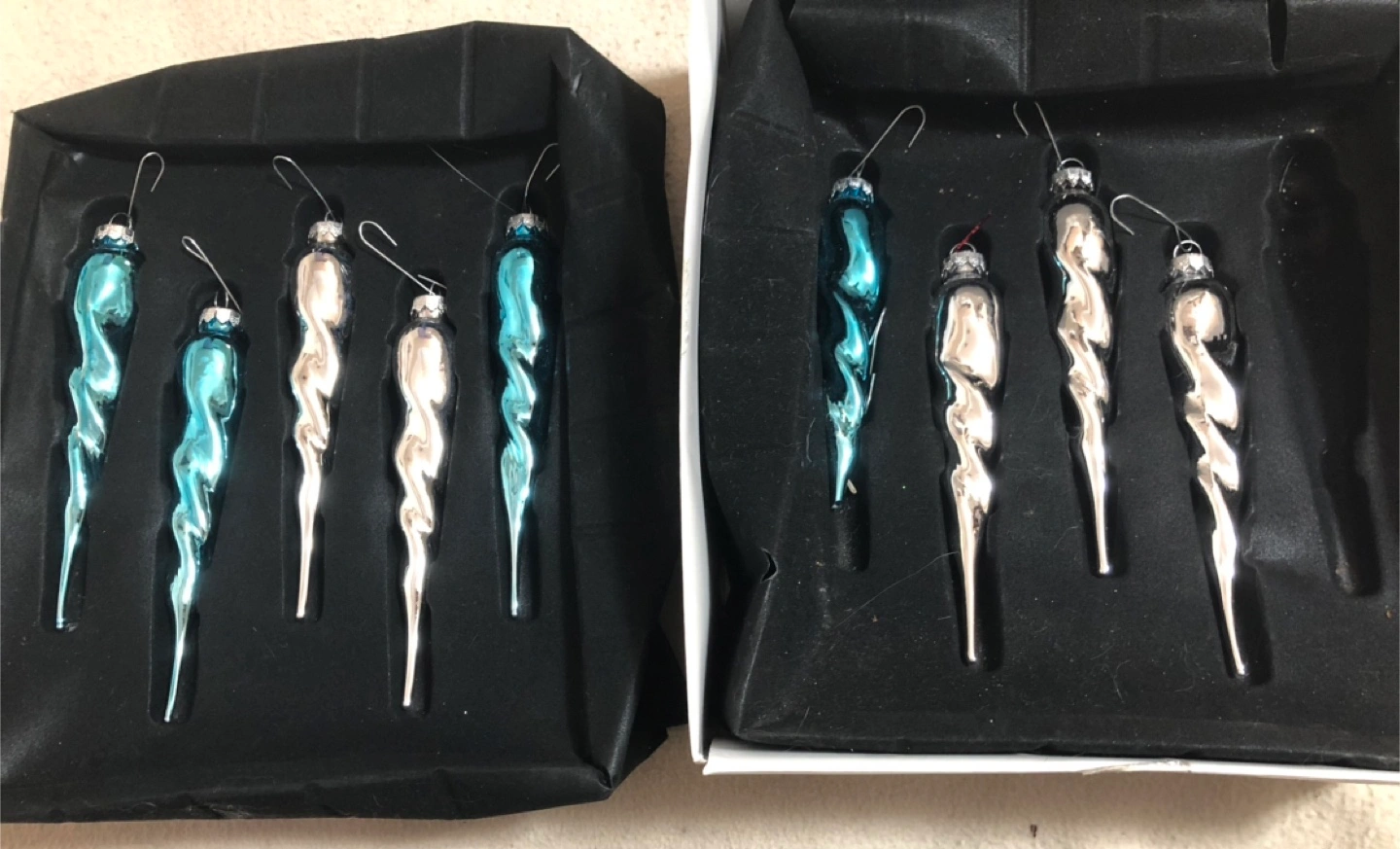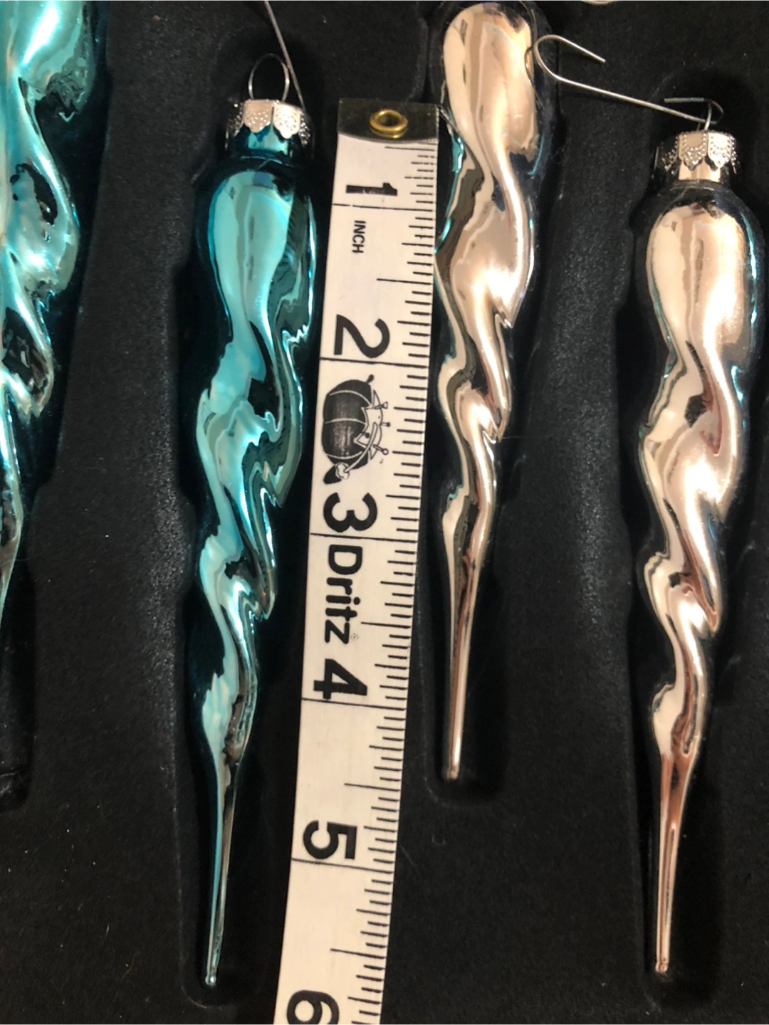 Elegant glass icicle ornaments in blue and silver.