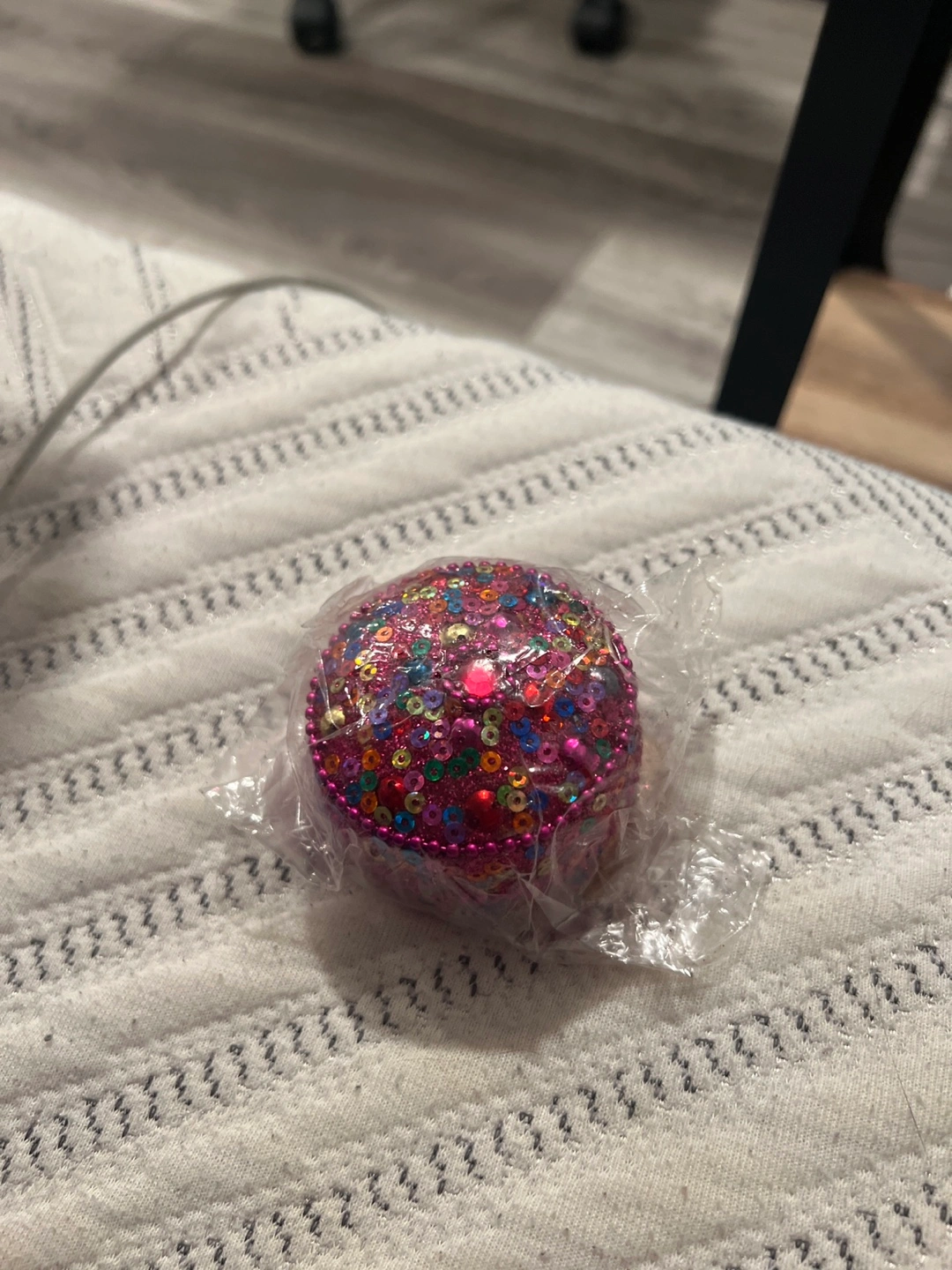 This is a small trinket box covered in colorful sequins and beads! It's perfect for storing jewelry or other small items. It's still in its original packaging! π₯