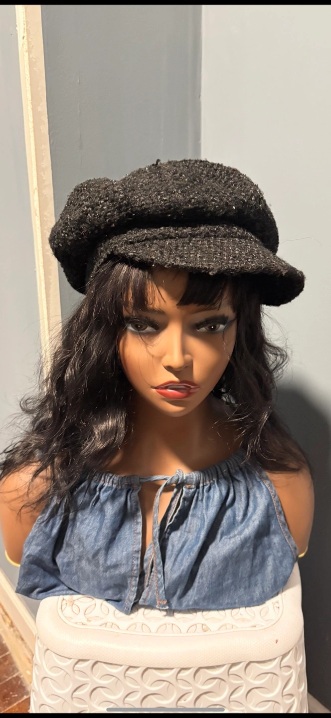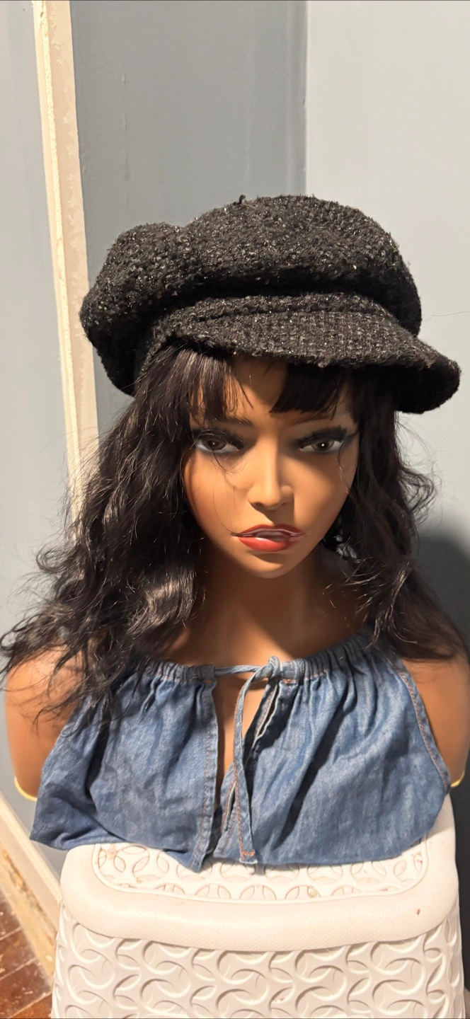 I'm selling a black newsboy cap. It's in great condition and ready for a new home! It's a stylish accessory to complete any outfit