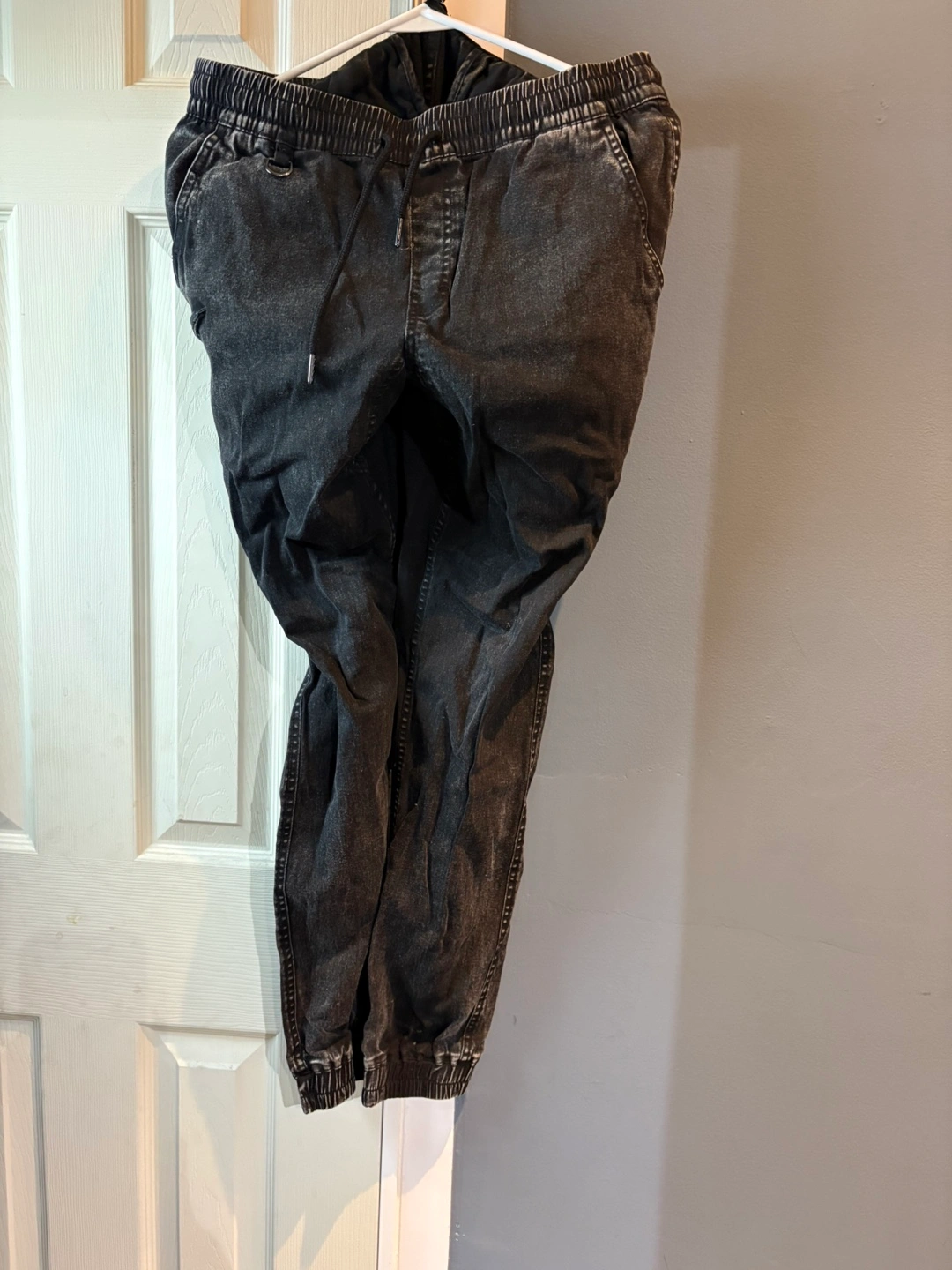 Selling a pair of black jogger pants. They feature an elastic waistband with a drawstring. Perfect for casual wear!