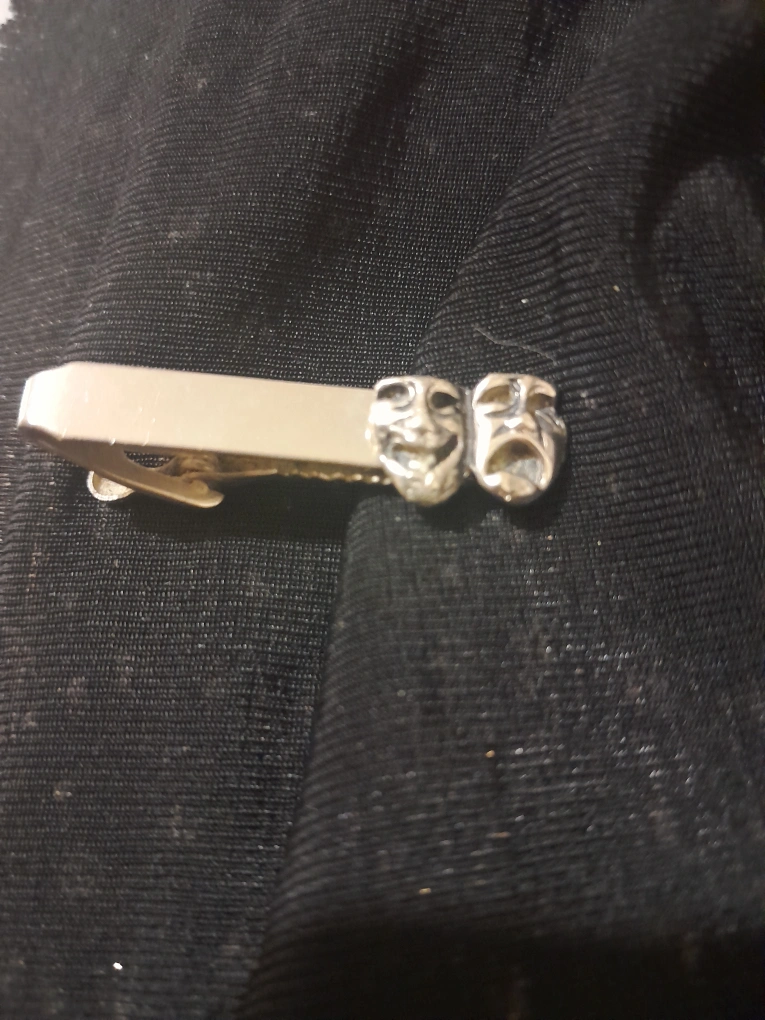 Here's a tie clip featuring comedy and tragedy masks. It's in good condition and ready to add a touch of theatrical flair to your wardrobe