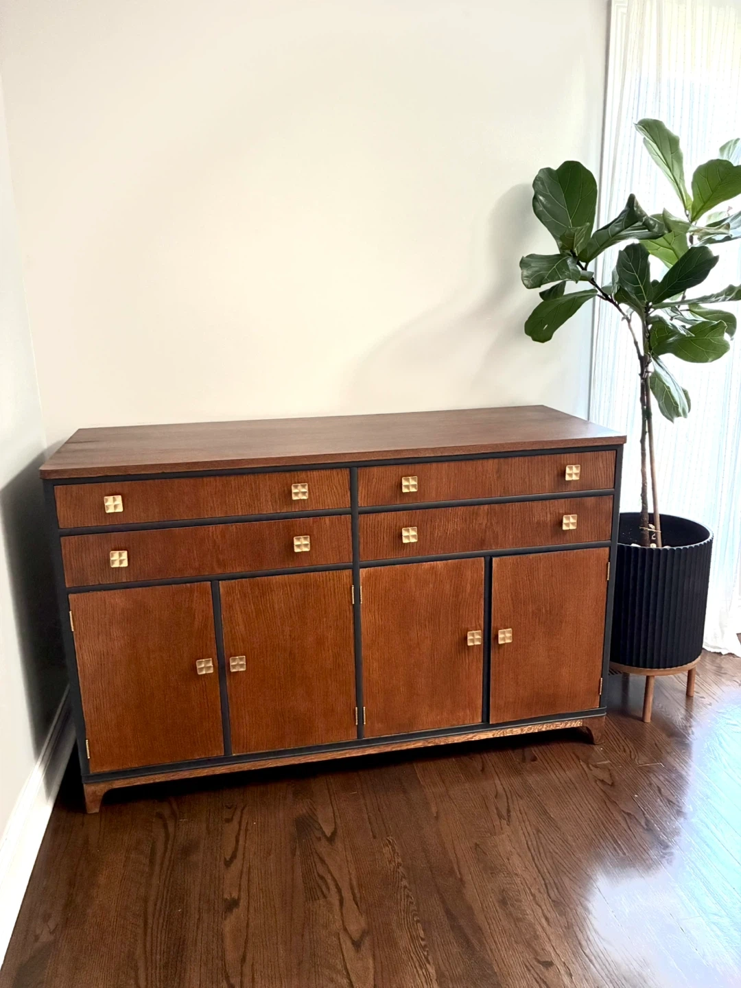 Solid wood Buffet. Refurbished and painted Flat Black, and with dark walnut. drawer, fronts, door, original hardware . All drawers and doors work as designed. Overall in great vintage condition. Pick up in Burbank. Hold only with a deposit of $20 rest cash. $240 price to sell