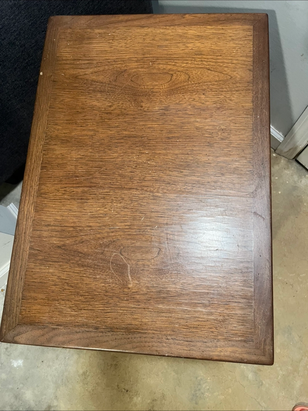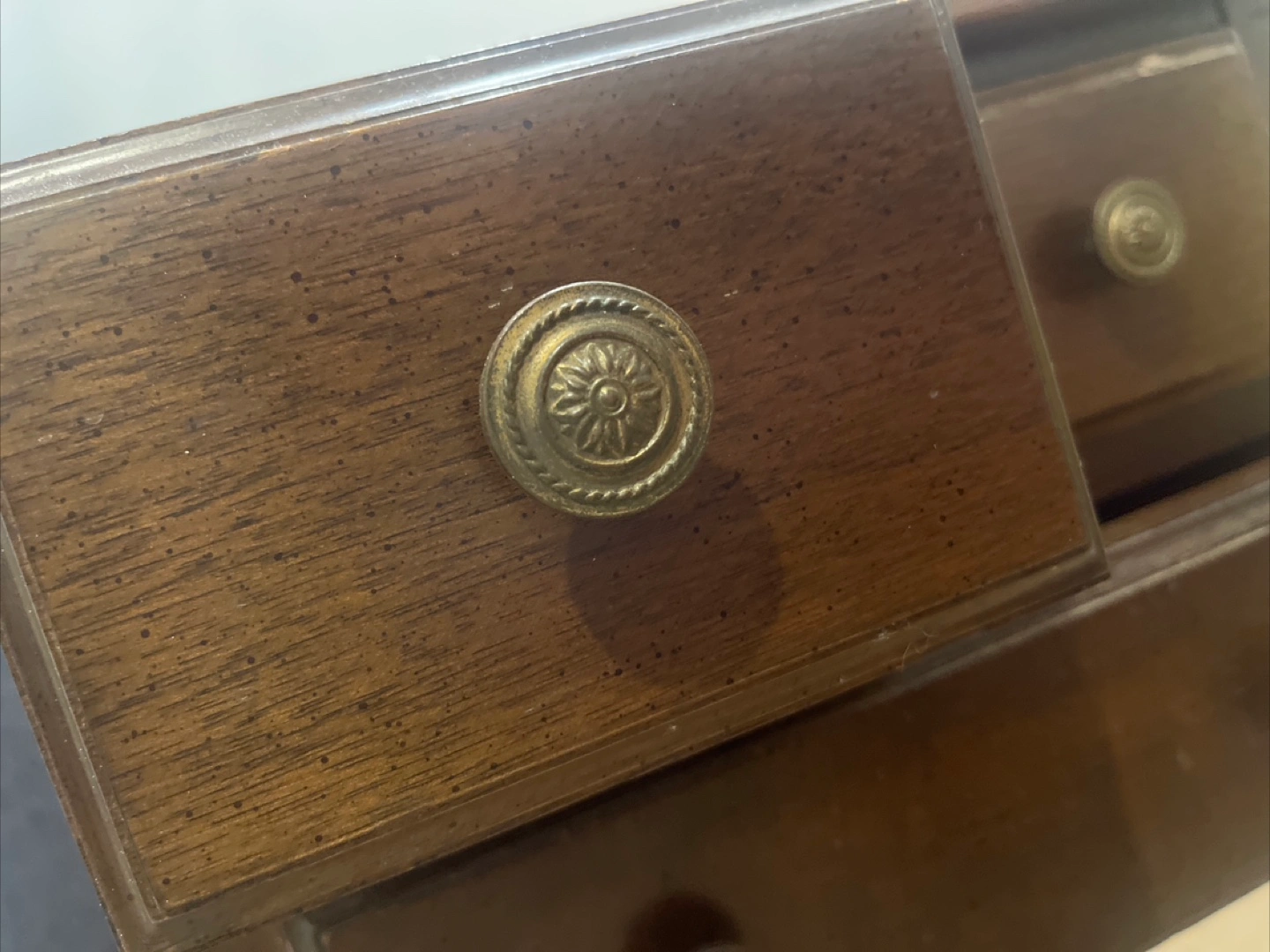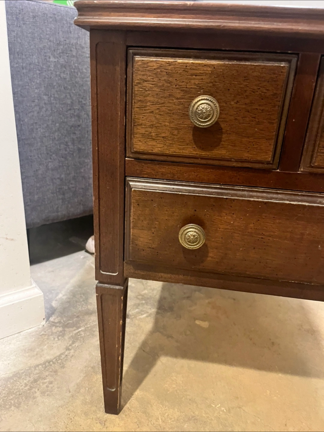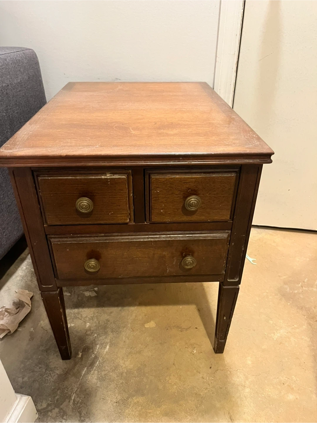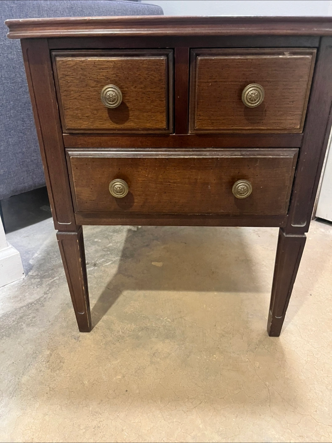 A charming vintage wooden end table with two small drawers on top and a larger drawer below. It features lovely brass knobs and a classic wood tapered leg design, perfect a touch of elegance to any room