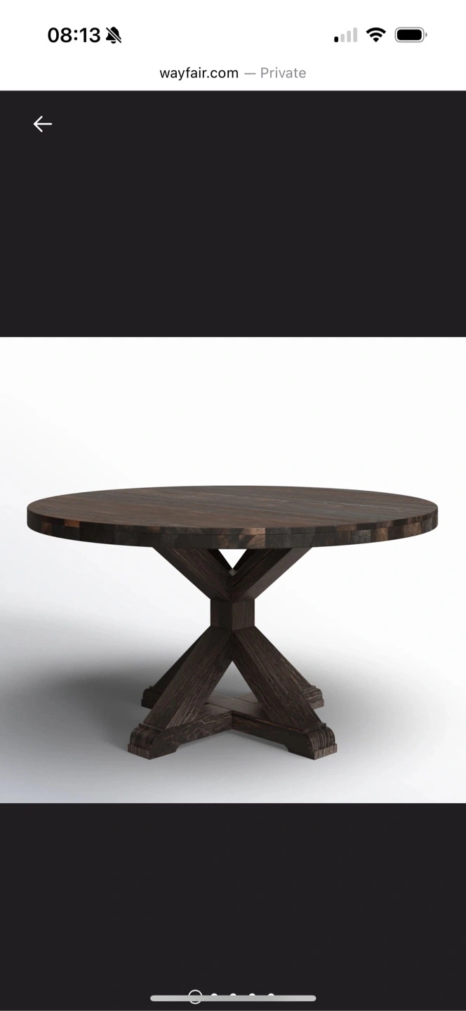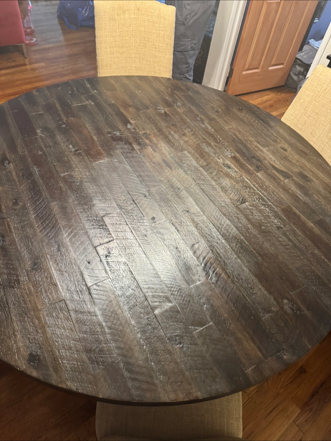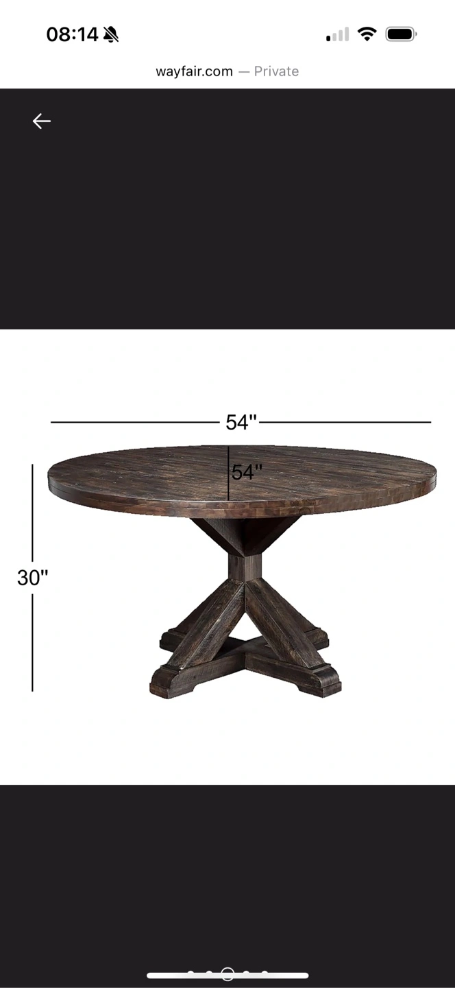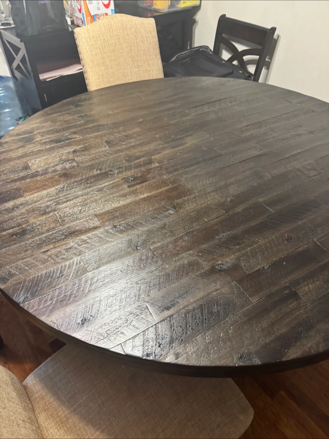 65Selling a round wooden dining table! It's in good condition and ready for a new home. The table has a dark wood finish and a sturdy base. Perfect for a smaller dining area or kitchen nook