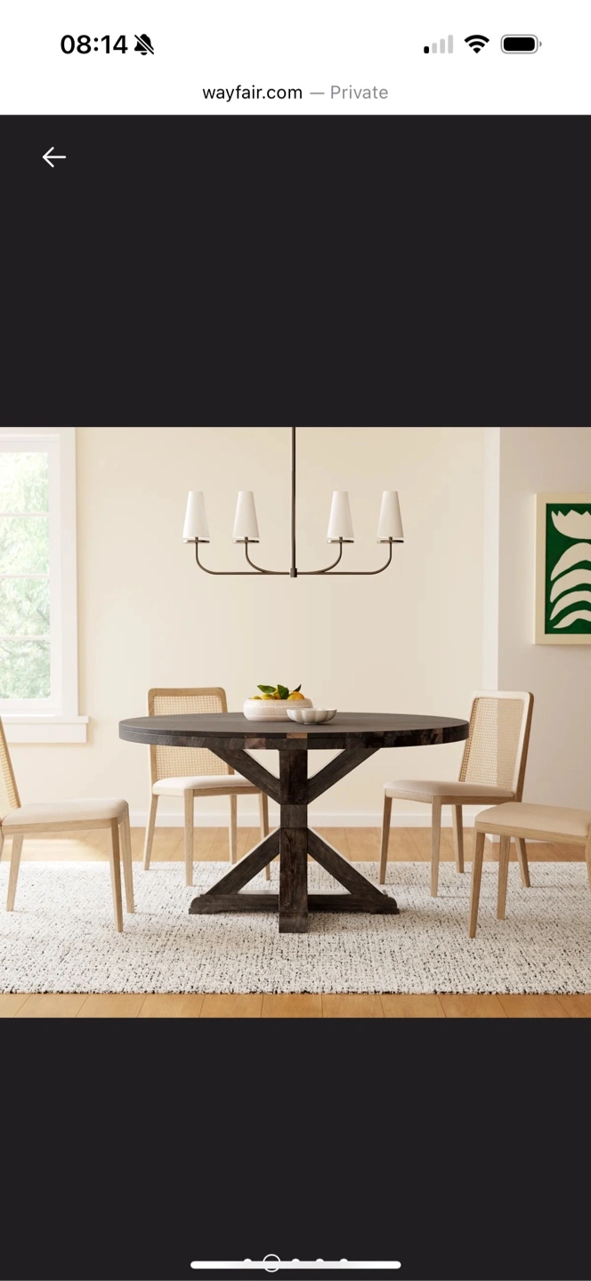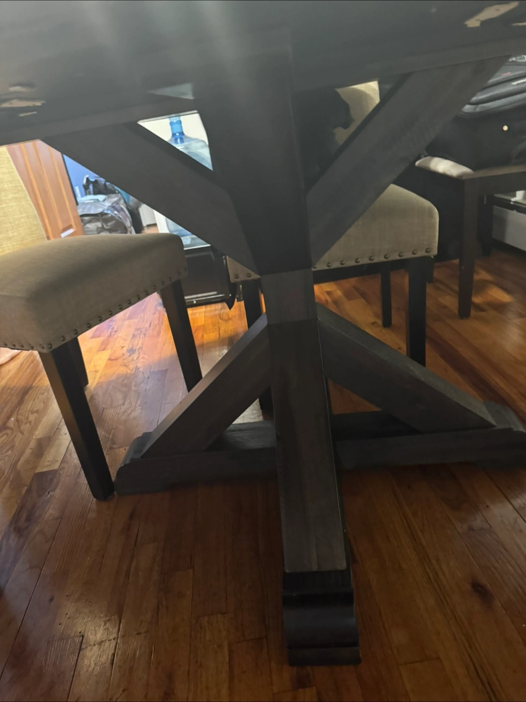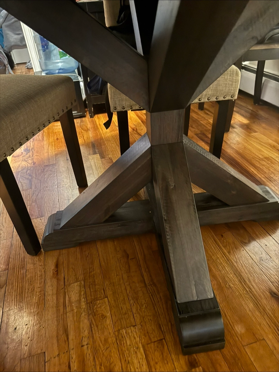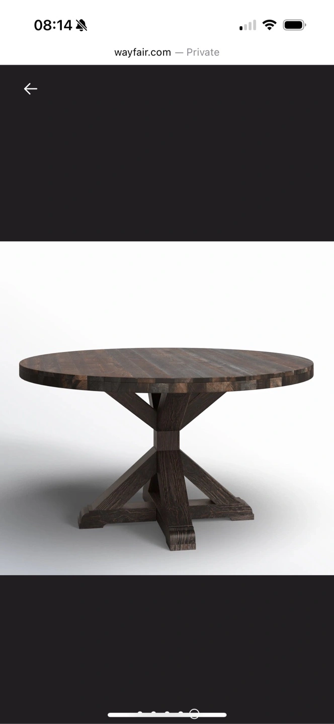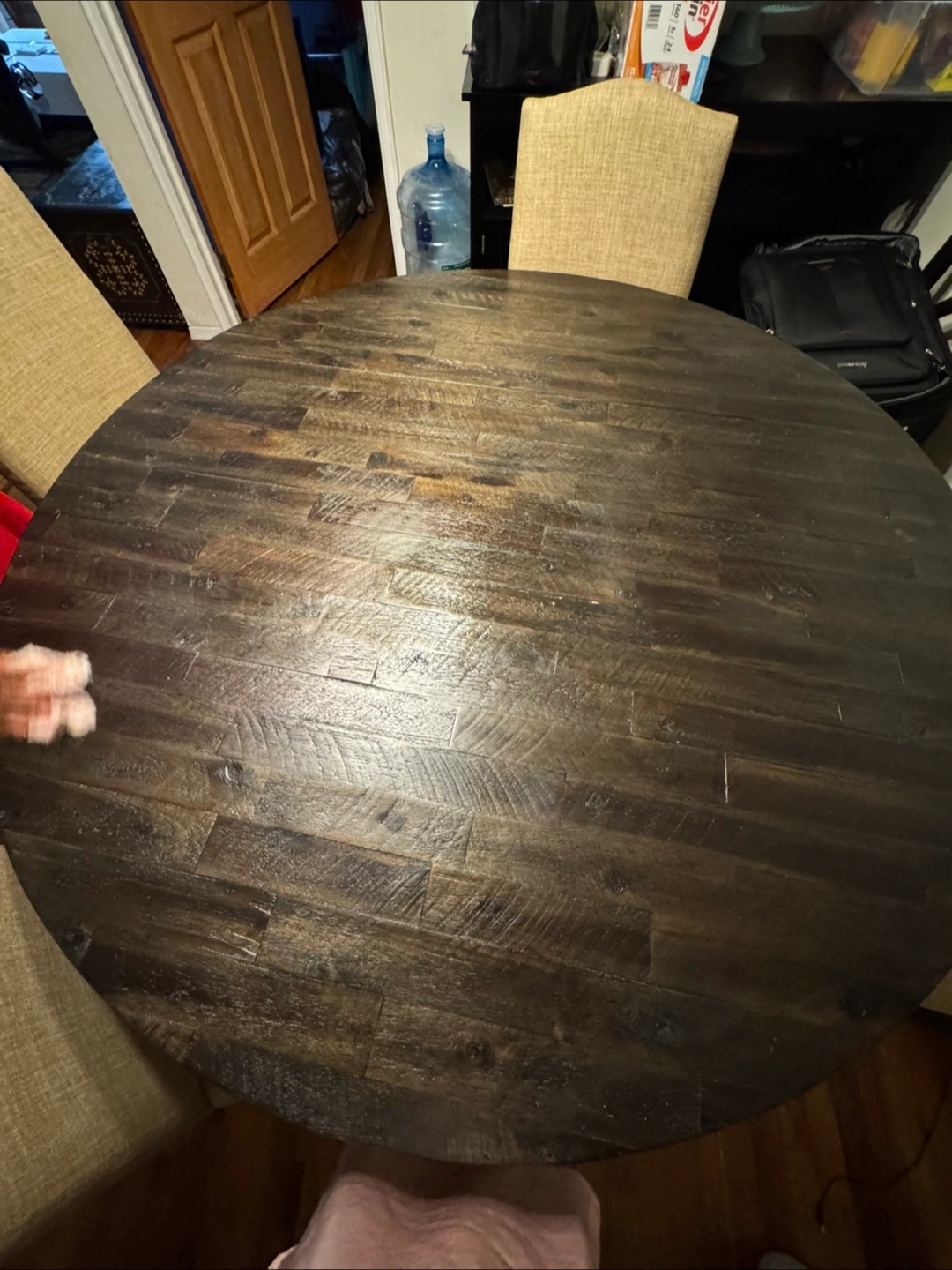 65Selling a round wooden dining table! It's in good condition and ready for a new home. The table has a dark wood finish and a sturdy base. Perfect for a smaller dining area or kitchen nook