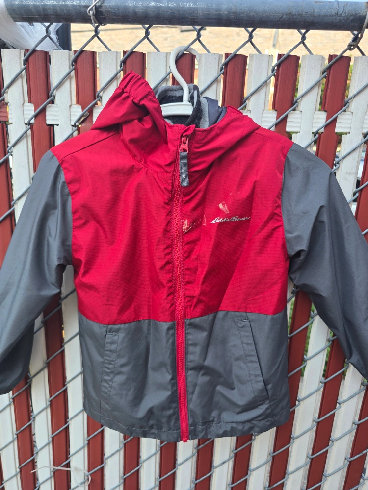 Selling an Eddie Bauer jacket for kids, size XS (5/6). It's red and gray, with a cool camo fleece lining to keep your little one warm and cozy!