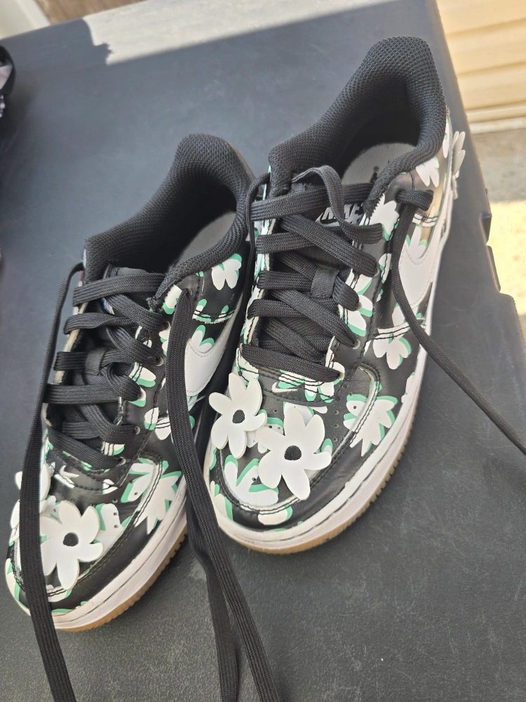 Nike Air Force 1 with custom flower design. These are girl''s size 3.5. The shoes are black and white with a gum sole. They have a unique, customized look with the added flower details!