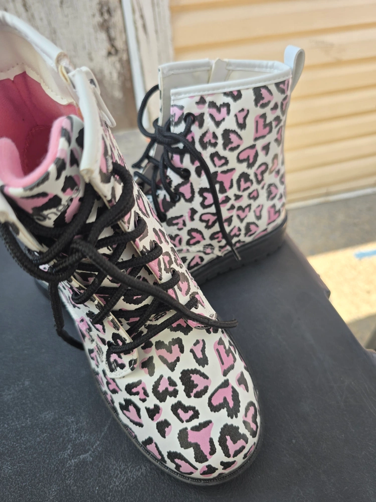Cute Skechers girl's boots with a fun white and pink leopard print! They have black laces and a side zipper for easy on and off. The inside is lined with pink fabric.