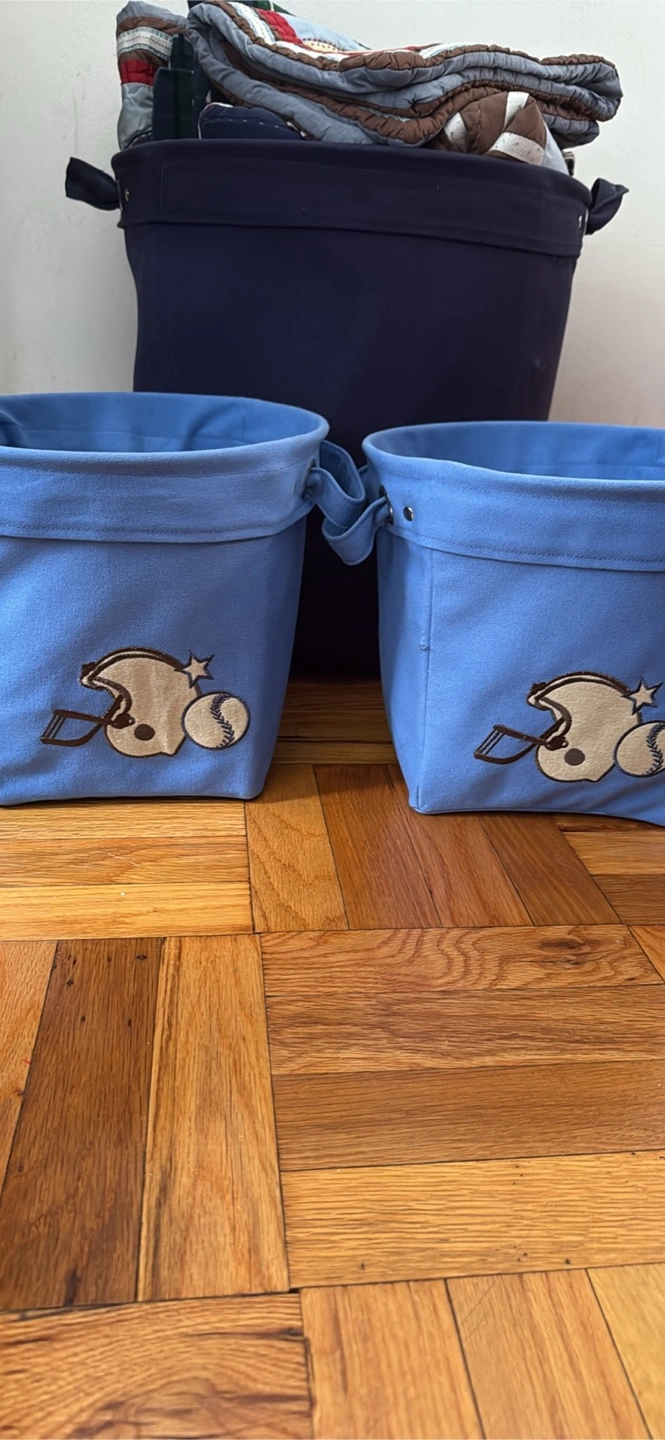 Selling a set of two light blue storage bins. They have a cute design with a football helmet, baseball, and star embroidered on the front. Perfect for organizing a kids room or playroom!