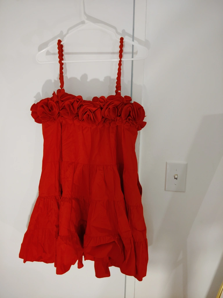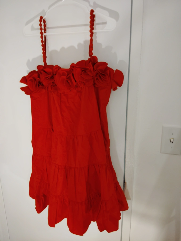 Selling a cute red dress from Saylor in size M. It has a tiered design and floral detailing at the top. Perfect for a party or a night out! Never worn.
