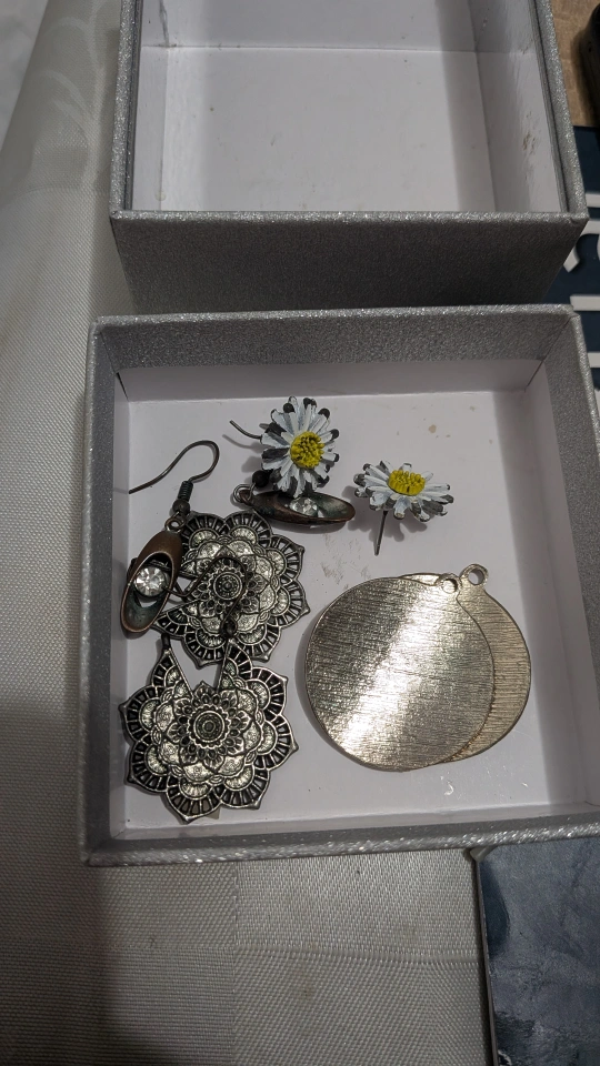 Selling a cute set of assorted earrings and a pendant! Includes a pair of floral drop earrings, daisy stud earrings, and a round pendant. Comes in a box for easy storage.