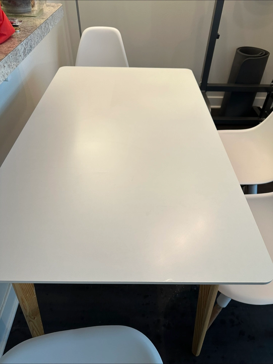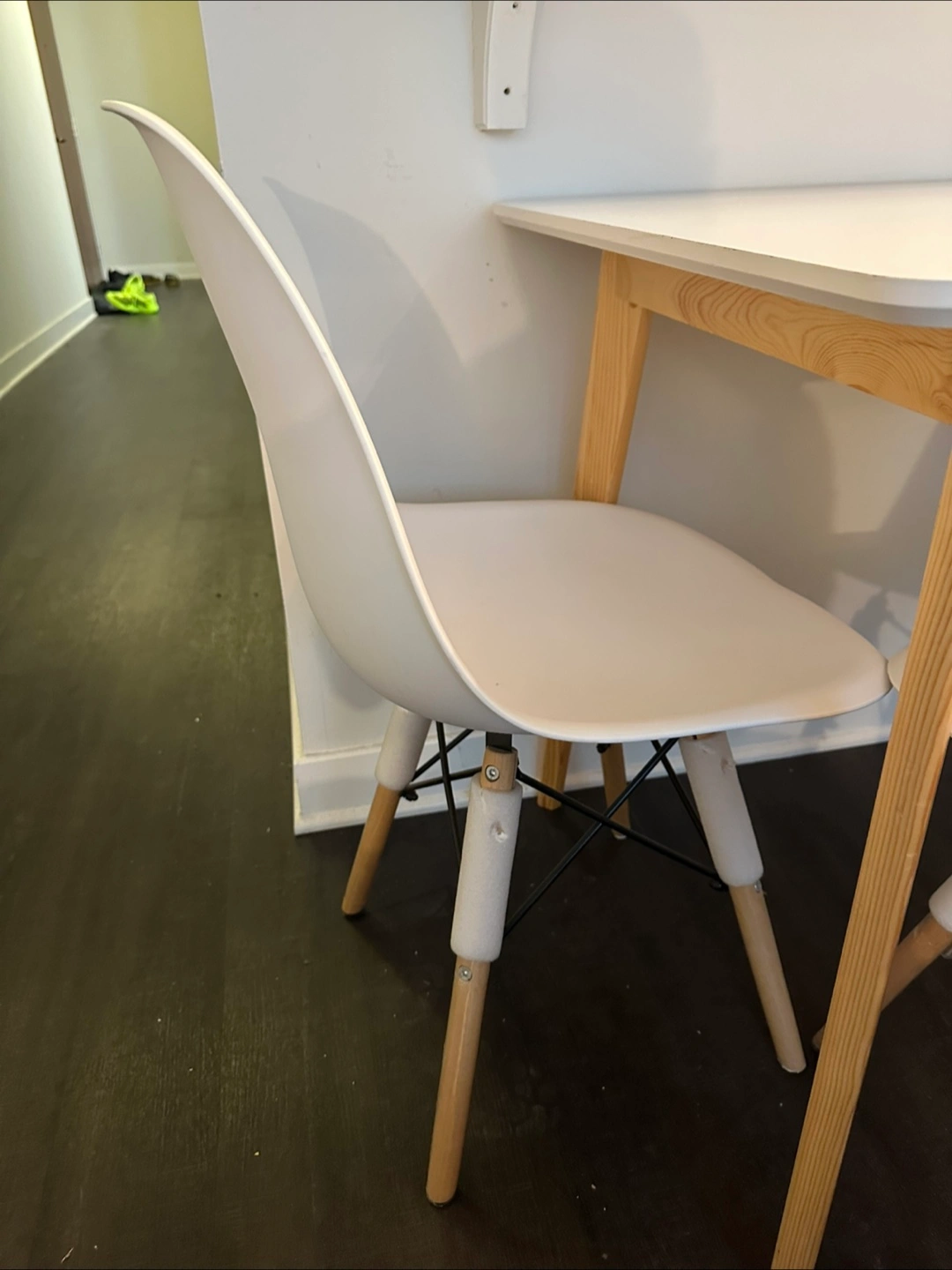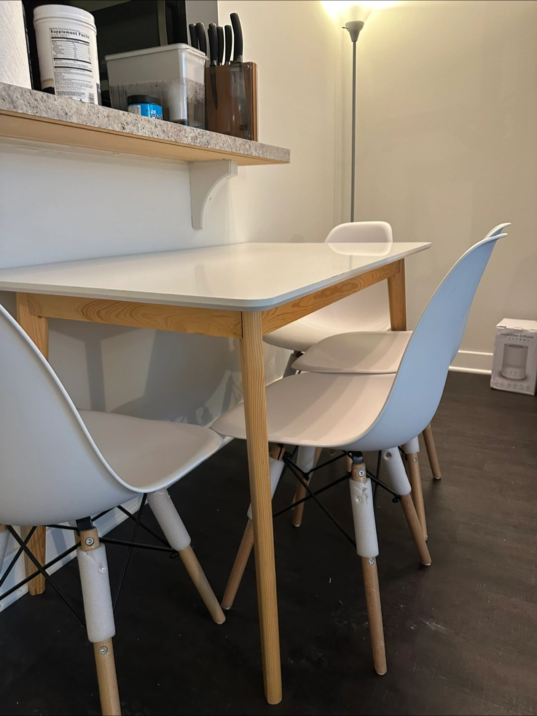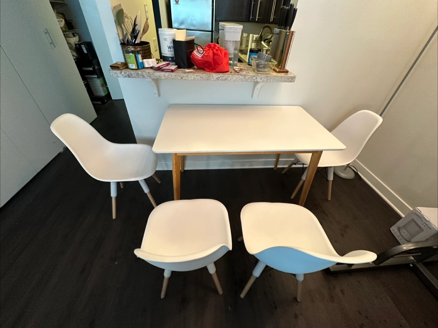 Selling a dining table with a set of 4 Eames style dining chairs. They are white and have a modern look with wooden legs. Great for any dining room or kitchen!