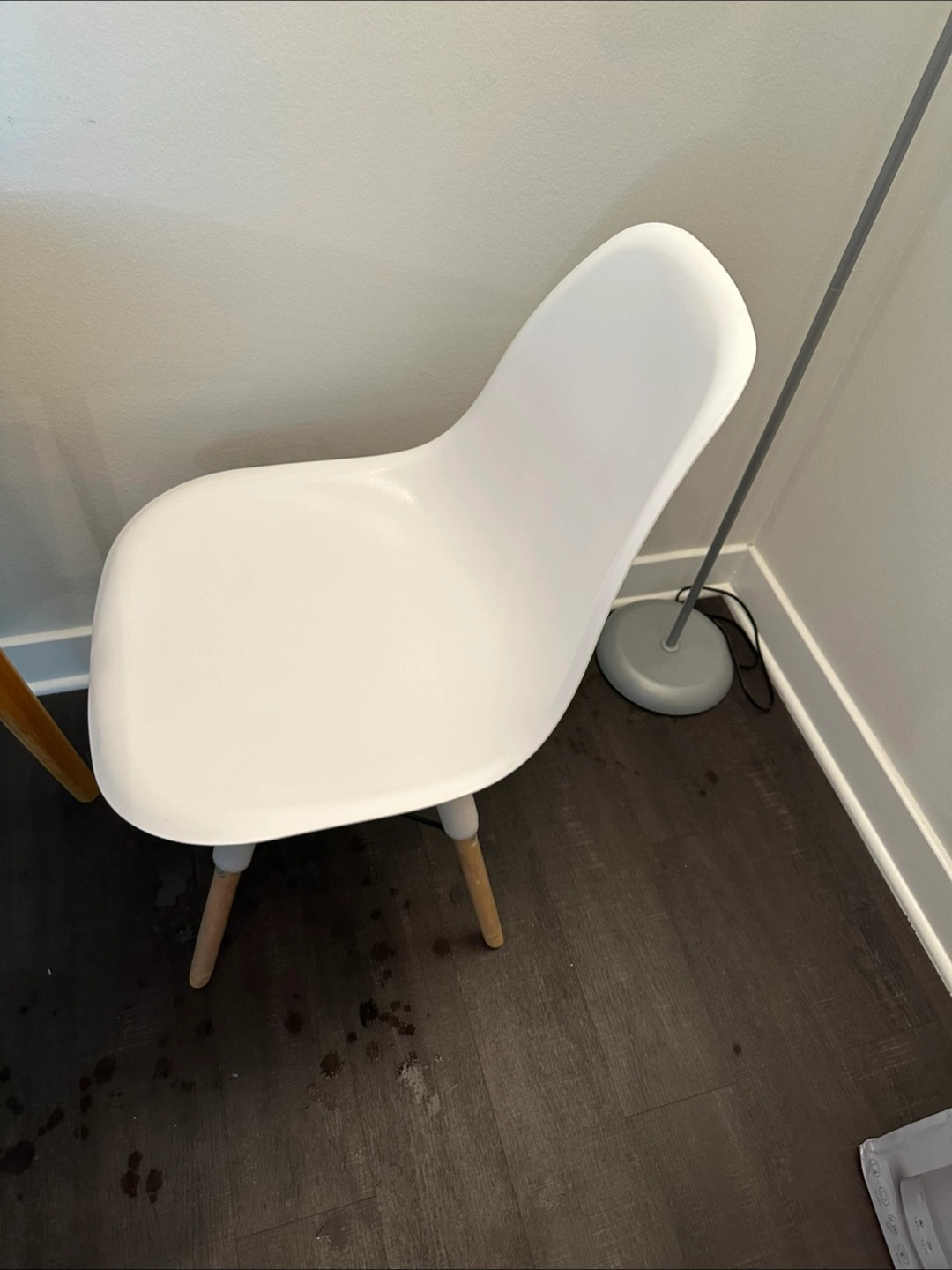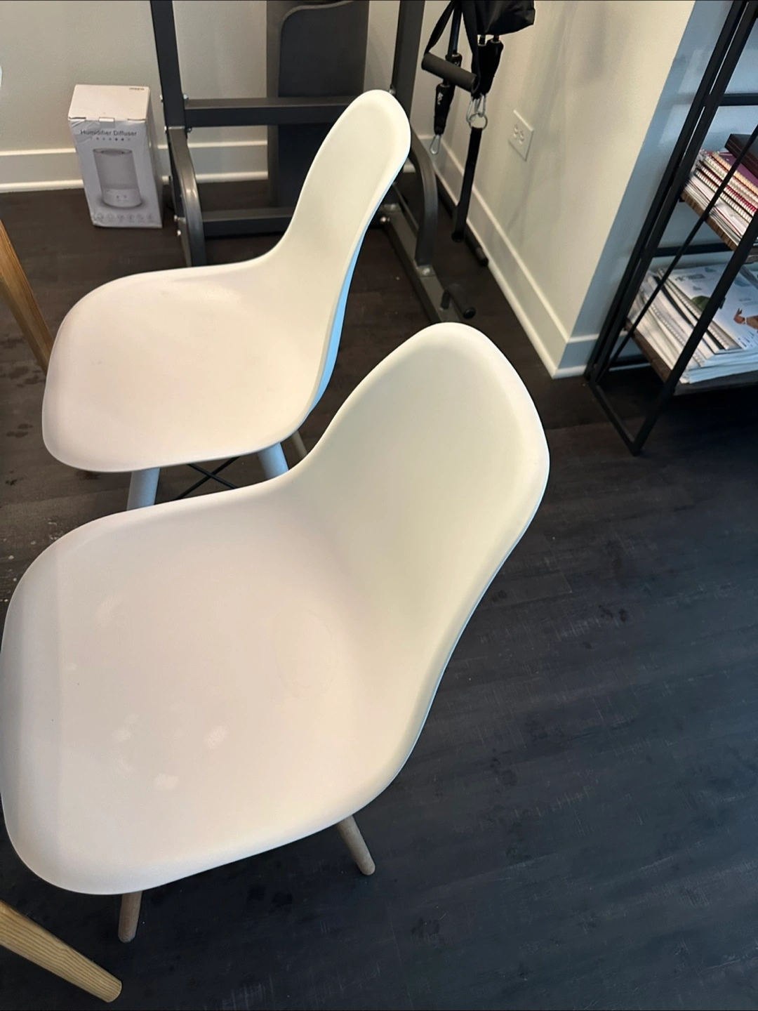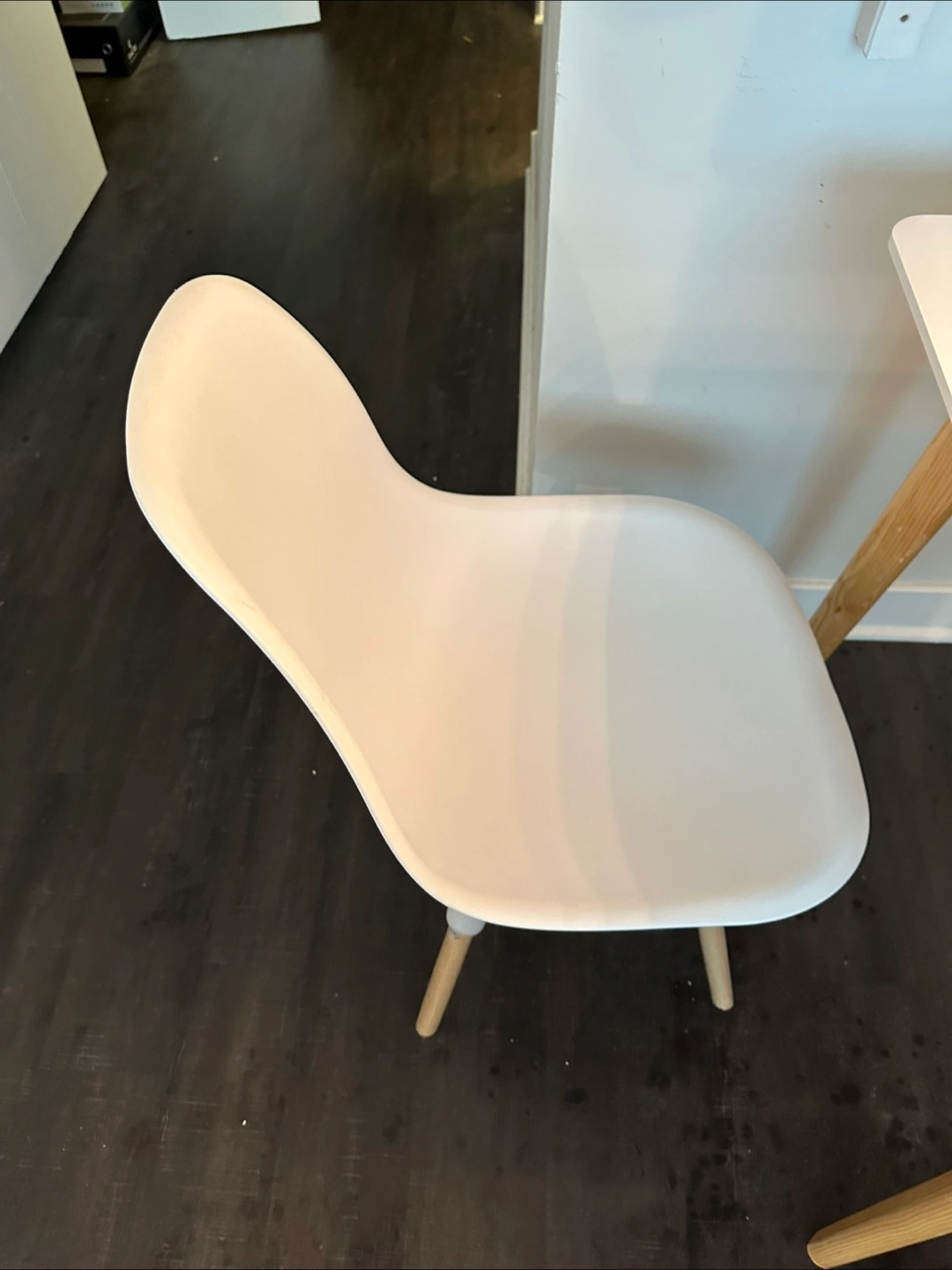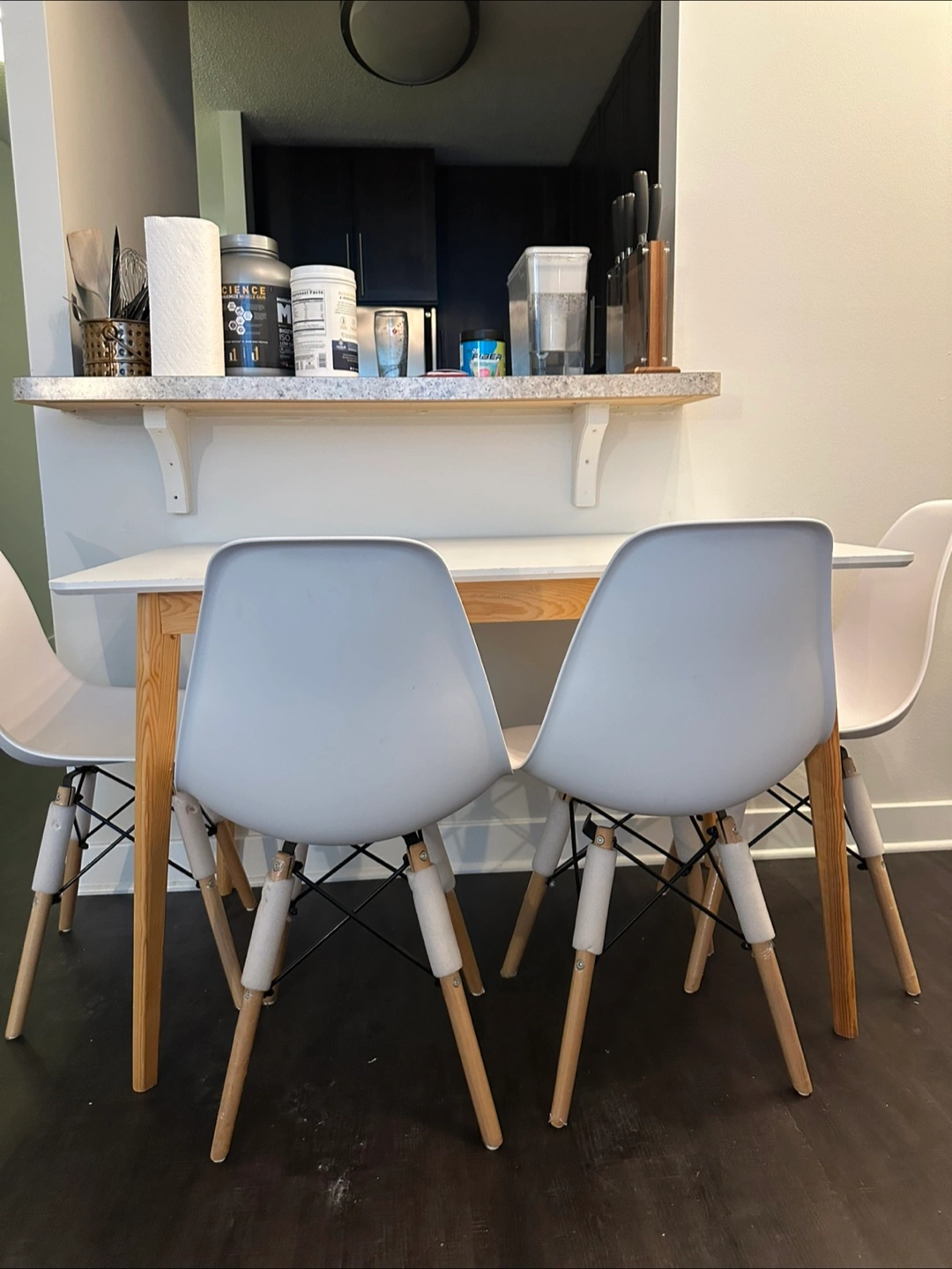 Selling a dining table with a set of 4 Eames style dining chairs. They are white and have a modern look with wooden legs. Great for any dining room or kitchen!