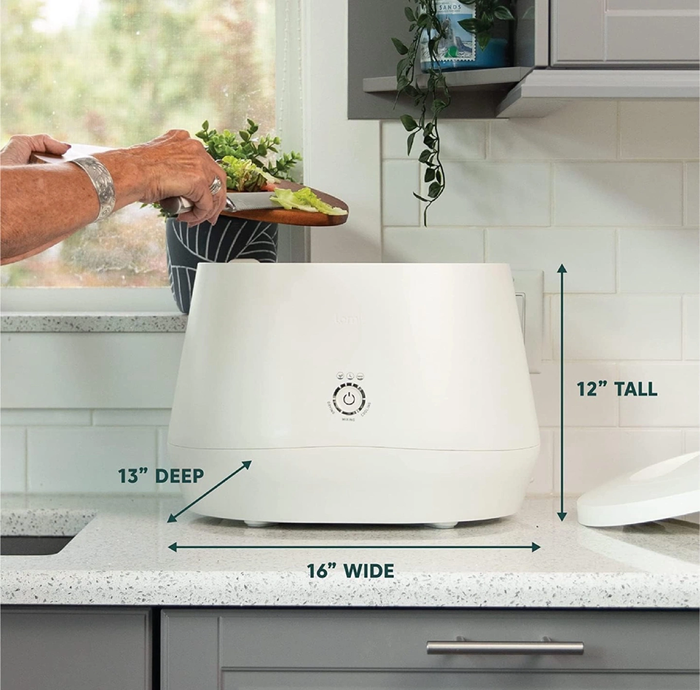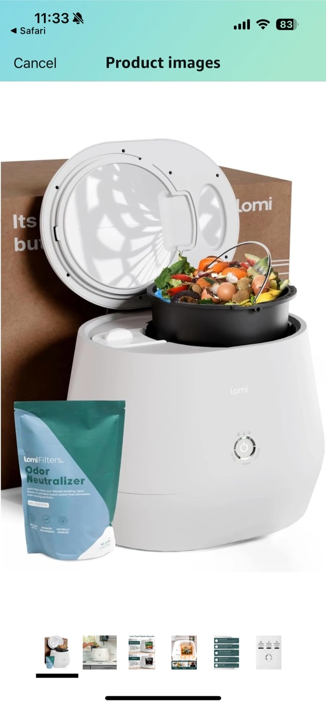 I'm selling a Lomi food waste composter in clean, used condition. It's a great way to reduce waste and create nutrient-rich dirt for your plants. I’m including 4 carbon filter refills which should last for over 3 months each depending on how often you use the machine. It has a few different modes: - Grow Mode: For preserving the microorganisms that create nutrient-rich dirt (14-16 hours) - Eco-Express: For those wanting the fastest result and lowest energy consumption (3-5 hours) - Lomi Approved: For food waste and Lomi Approved packaging and products (5-8 hours) The dimensions are approximately 12" tall, 13" deep, and 16" wide. It’s quite heavy, so be prepared.