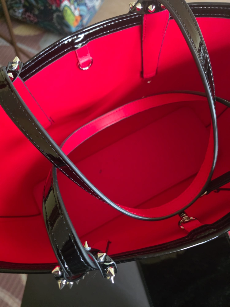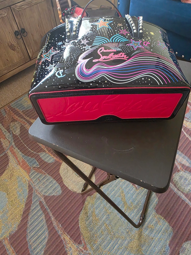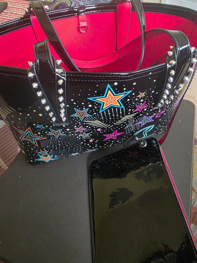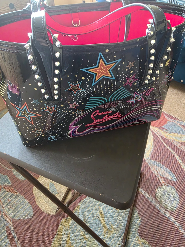 Selling a Christian Louboutin black patent tote bag. It features a vibrant star design and studded accents. The interior is a bright red. It's in great condition and ready for a new home